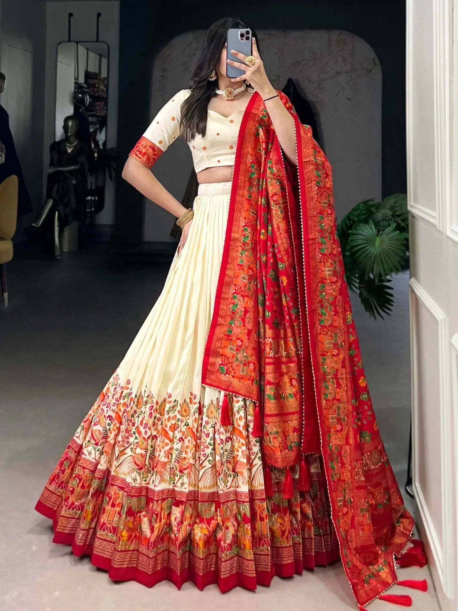 Amazing off-white tussar silk party wear lehenga choli set showcases a blend of elegance and tradition. the lehenga features striking digital foil prints of traditional elephant and peacock motifs, adding a regal and cultural flair to the soft, off-white base—making it perfect for festive and party occasions.