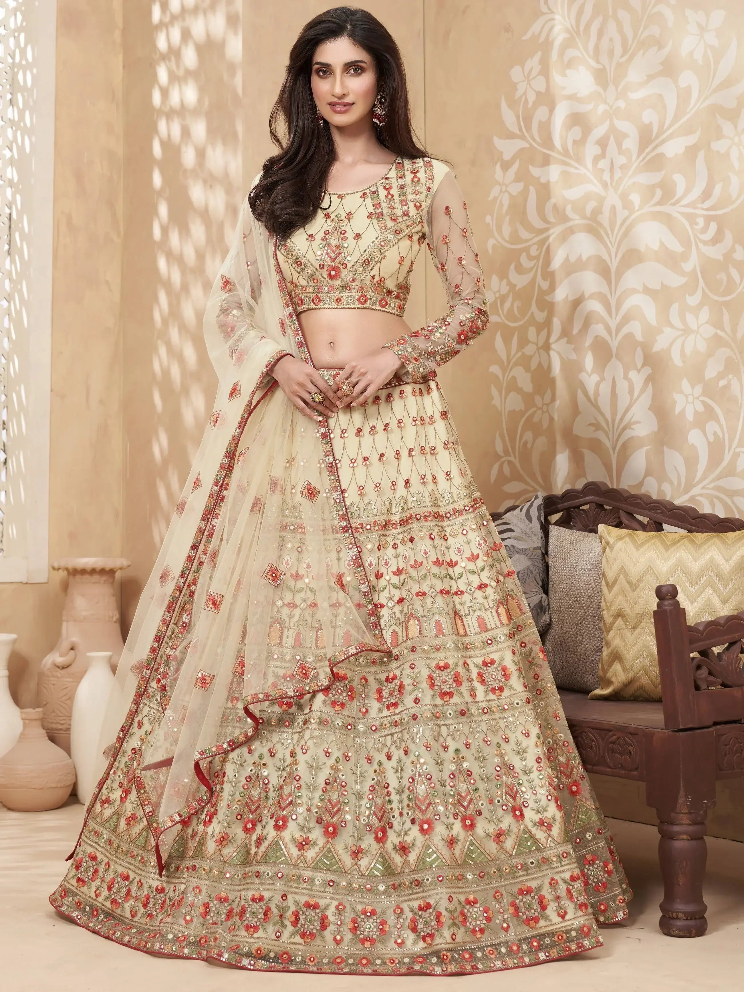 This lehenga comes similar color net choli with banglori silk inner and a similar color border net dupatta.