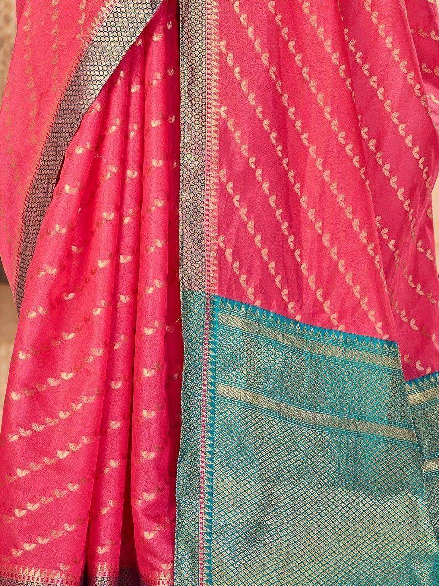 One of the key benefits of this saree is its versatility. Whether you're attending a wedding, festival, or any other special occasion, this saree is the perfect choice to make a statement. The pink color and zari work give it a gorgeous wedding look, making you the center of attention wherever you go.