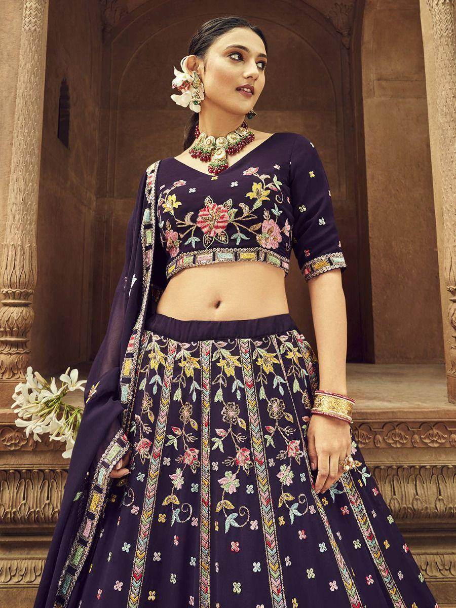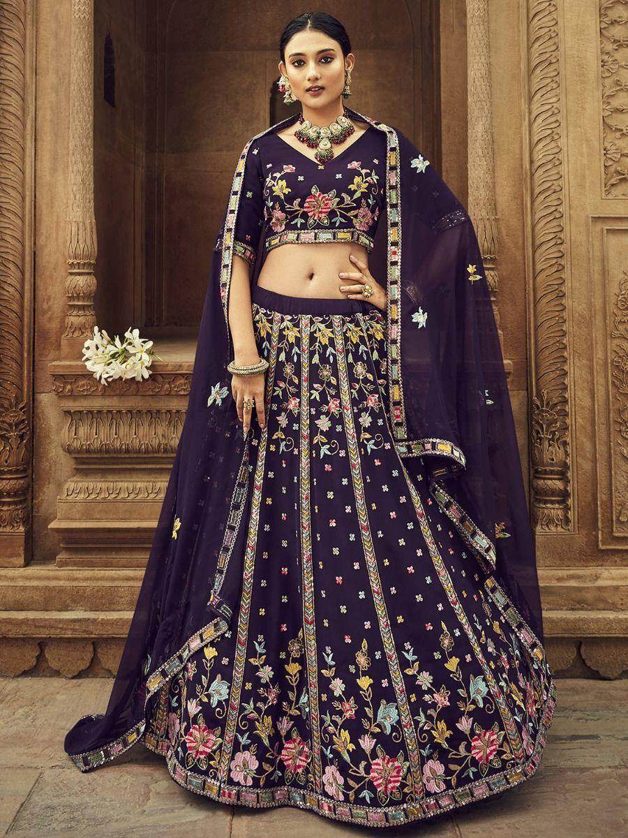 A medley of vibrant colors, aesthetic designs, and mesmerizing charm, here comes our georgette wedding lehenga choli collection. This purple color lehenga is beautified with thread, and sequins embroidered work.
