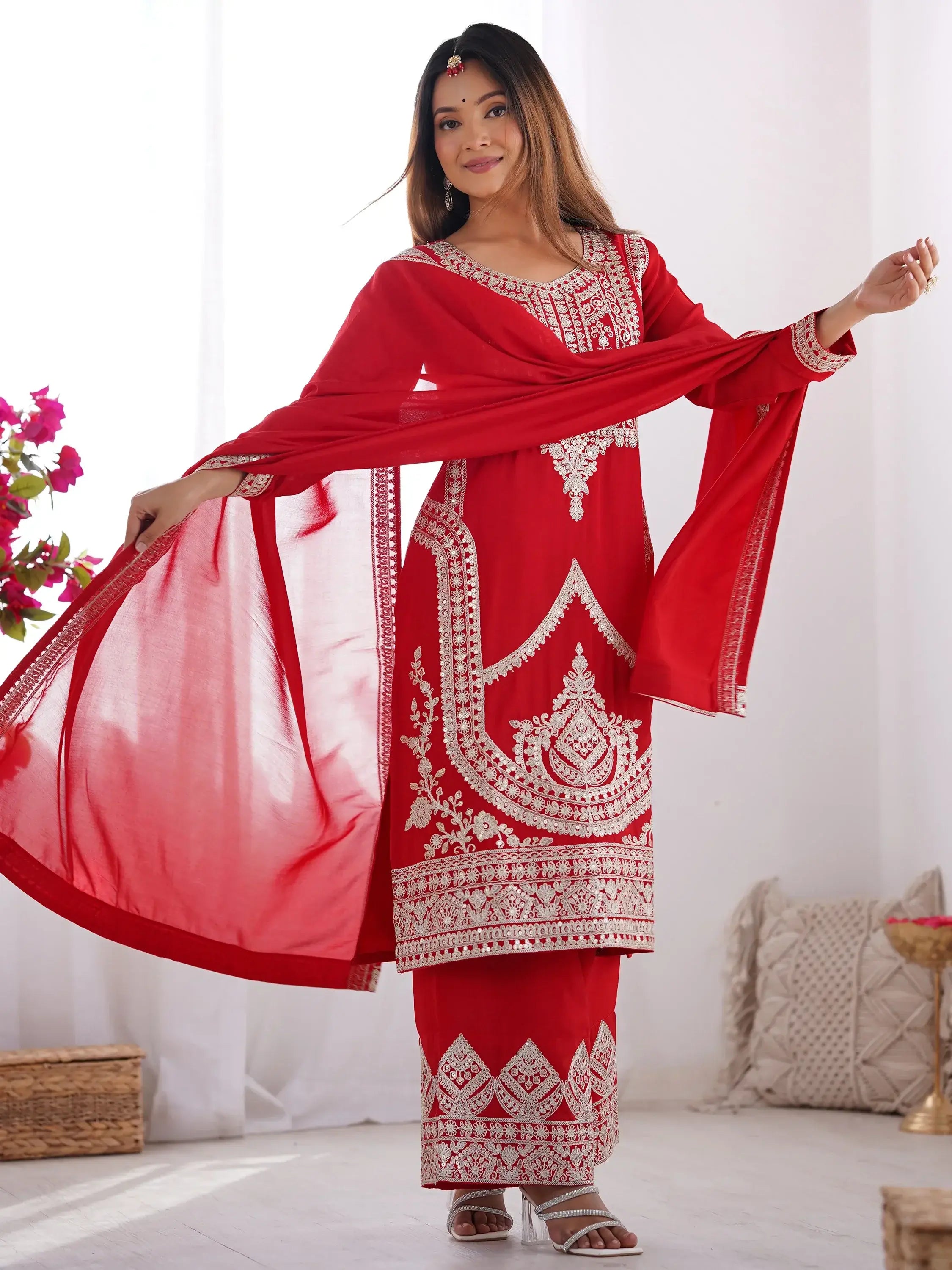 The matching red vichitra silk palazzo features similar intricate detailing, adding a coordinated and graceful flair to your look. Completing the set is a stunning red vichitra silk dupatta with dori, embroidery, and sequin lace work that adds to the overall charm and elegance of the outfit.