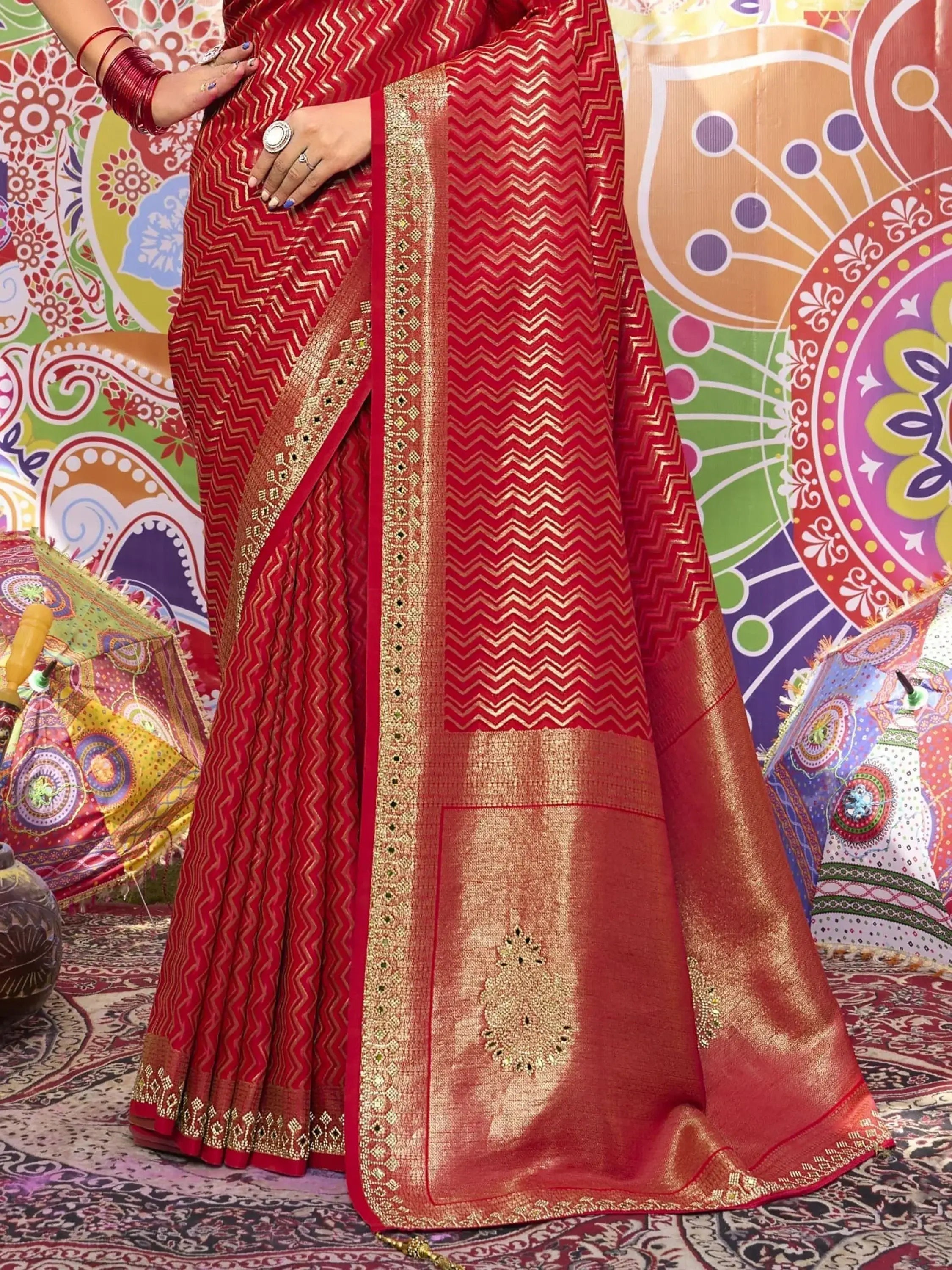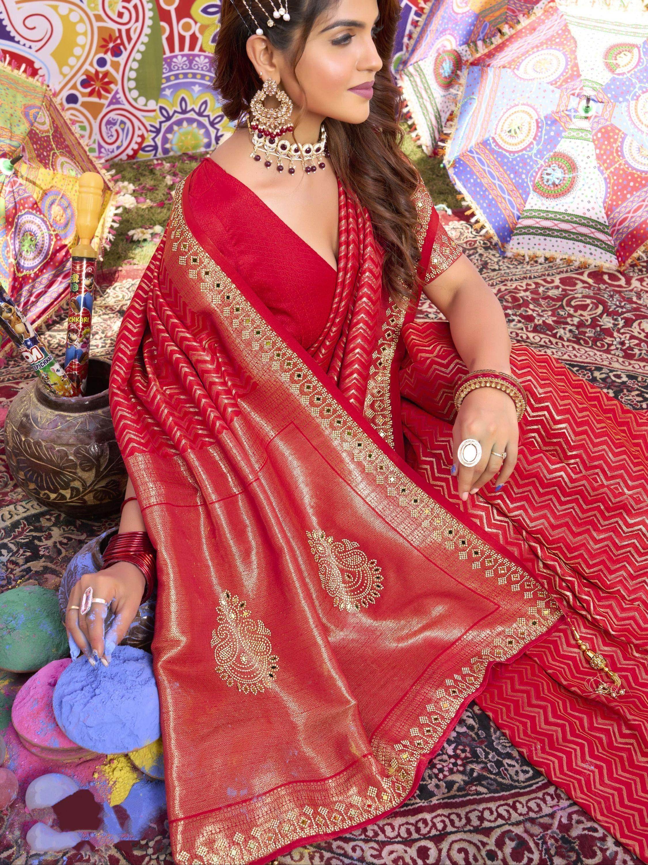 Step into the realm of timeless elegance with this stunning red satin saree, adorned with exquisite mirror handwork, zari weaving, and zarkan embellishments. Crafted with precision and attention to detail, this saree exudes a captivating allure that is sure to leave onlookers spellbound. With a generous length of 5.50 meters, it drapes gracefully around the body, enveloping the wearer in a veil of sheer sophistication.