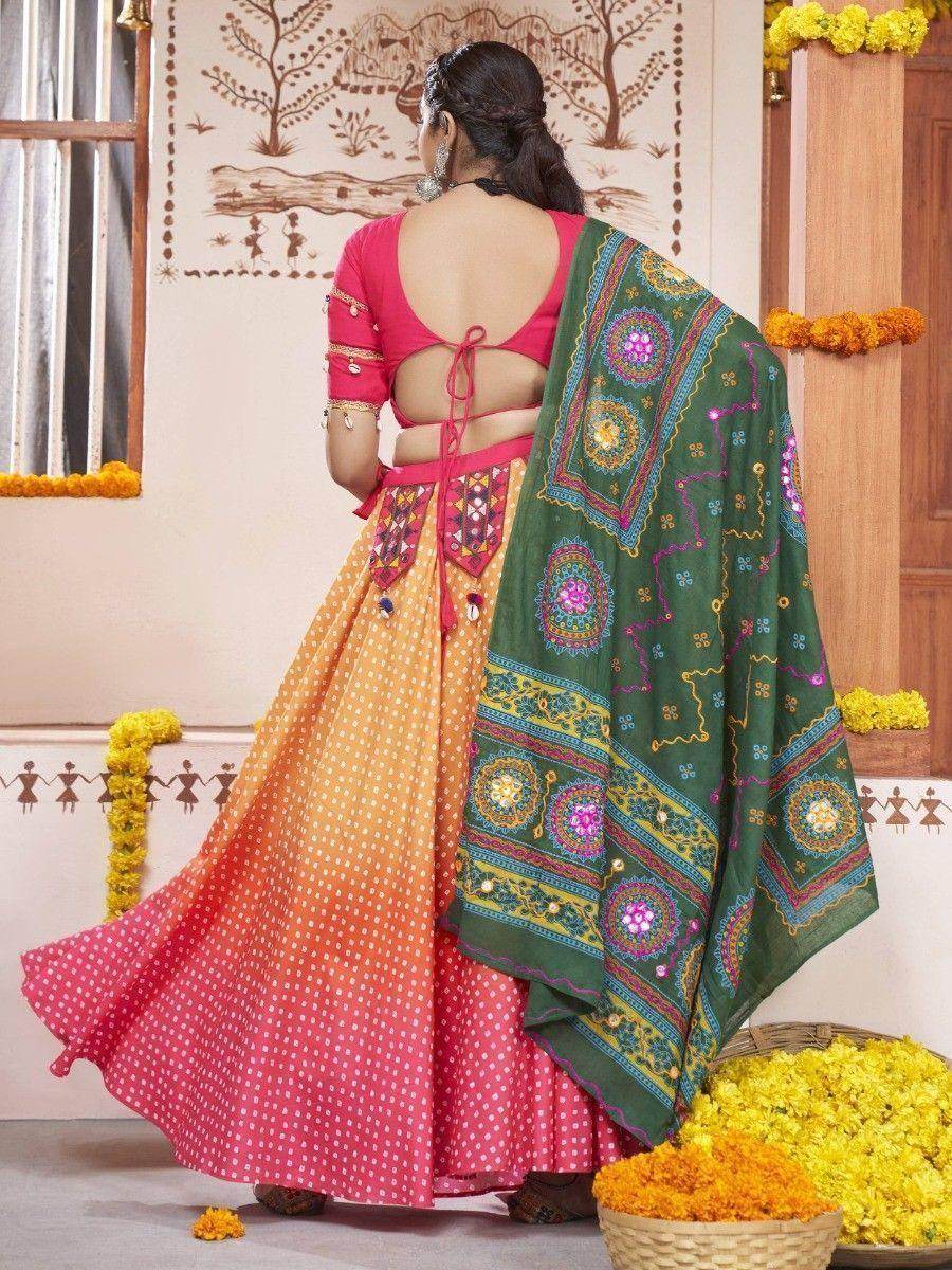 The choli, in a stylish pink color, features rayon material with thread embroidery work and mirror work. The mirrors add a touch of glamour and catch the light, creating a dazzling effect. The lehenga comes with a green color cotton dupatta, featuring thread embroidery work and mirror work. It also includes digital printed work, adding an extra layer of depth and elegance. Additionally, it comes with a rani pink mirror work belt, completing the ensemble.