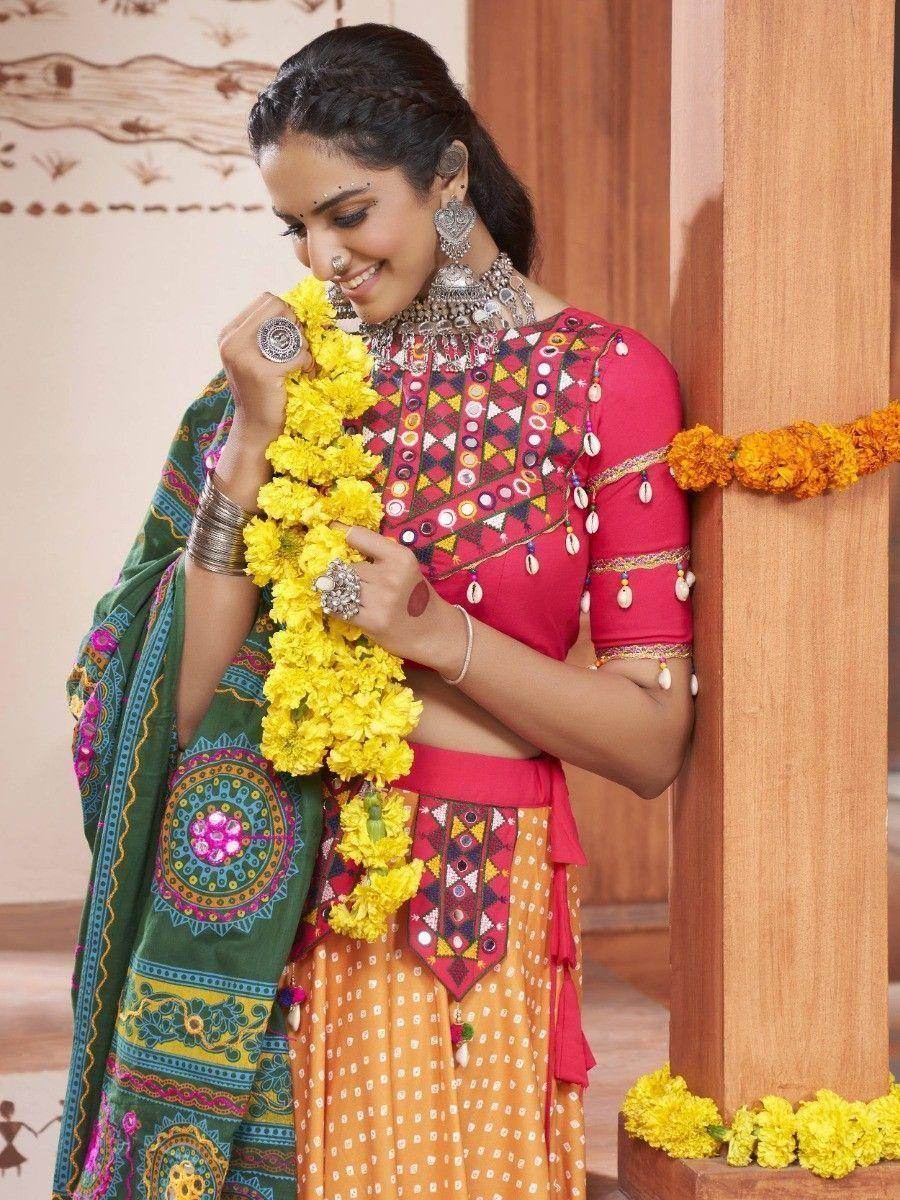 The "amazing yellow digital printed rayon navratri lehenga choli" is a must-have for anyone looking to make a statement during the festive season. Its yellow rayon material, combined with digital printed work and mirror work, creates a captivating ensemble. Whether you're attending Navratri celebrations or any other festive occasion, this lehenga choli will surely make you the center of attention.