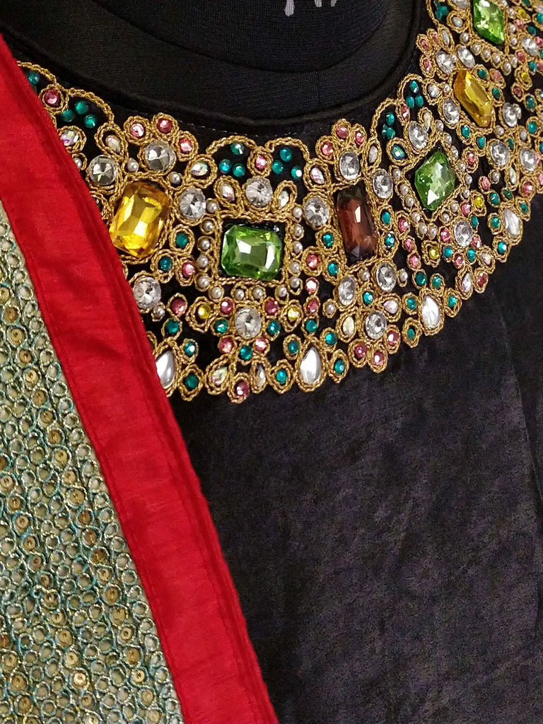 It pairs with black velvet blouse featured intricate embroidered jewel neckline and dupatta with dori and sequins embroidered with stone.