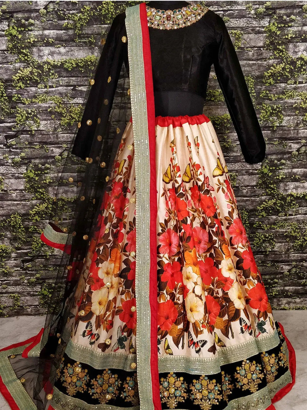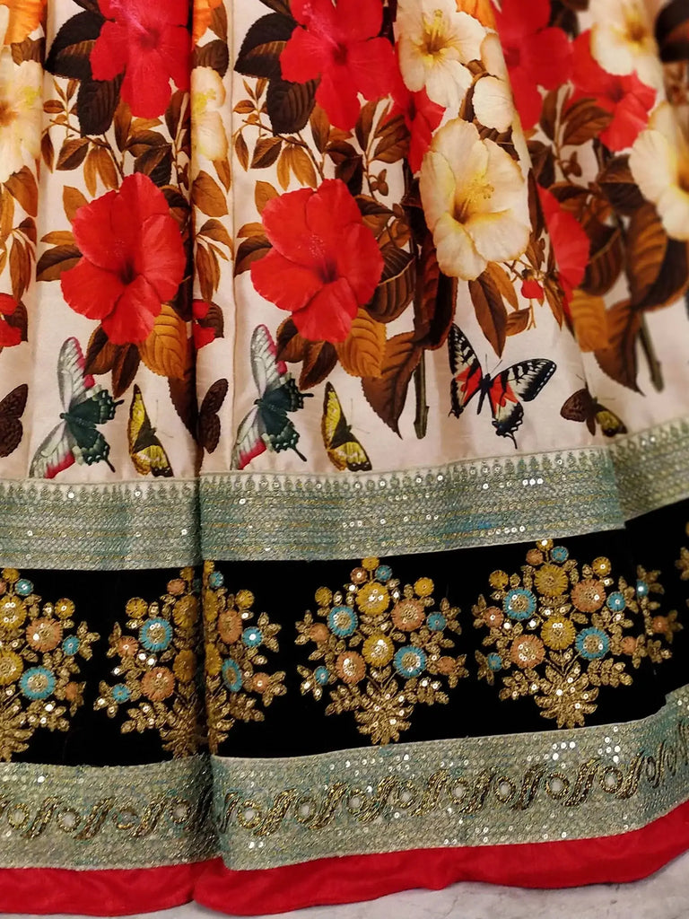 Featuring Designer Beautiful multi colored floral lehenga with digital print with dori, sequins & multi colored thread embroidered work in banglory silk fabric.