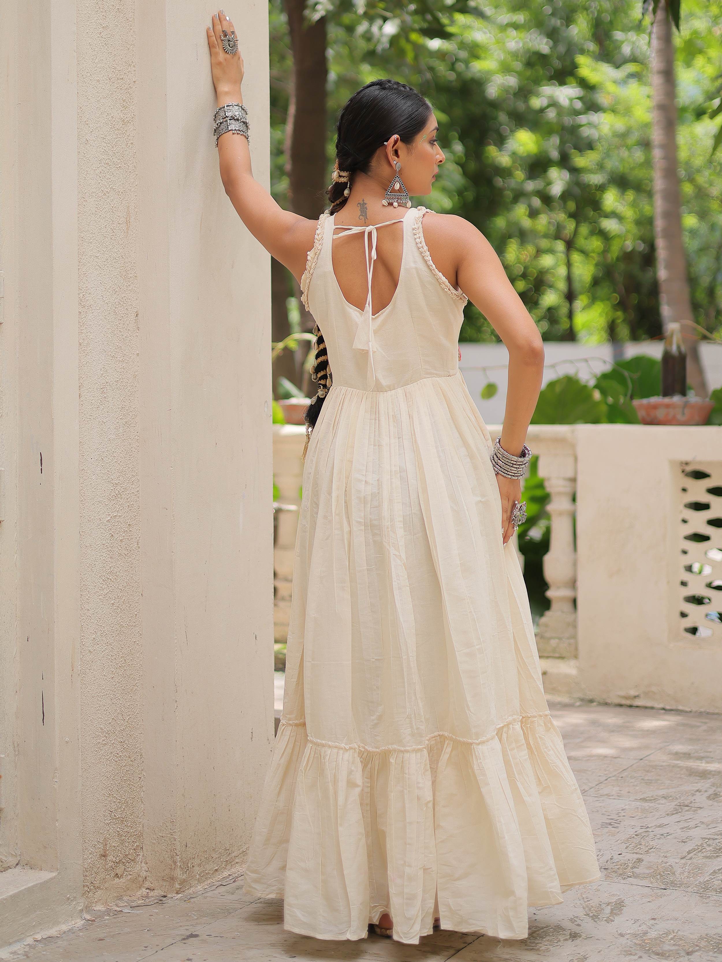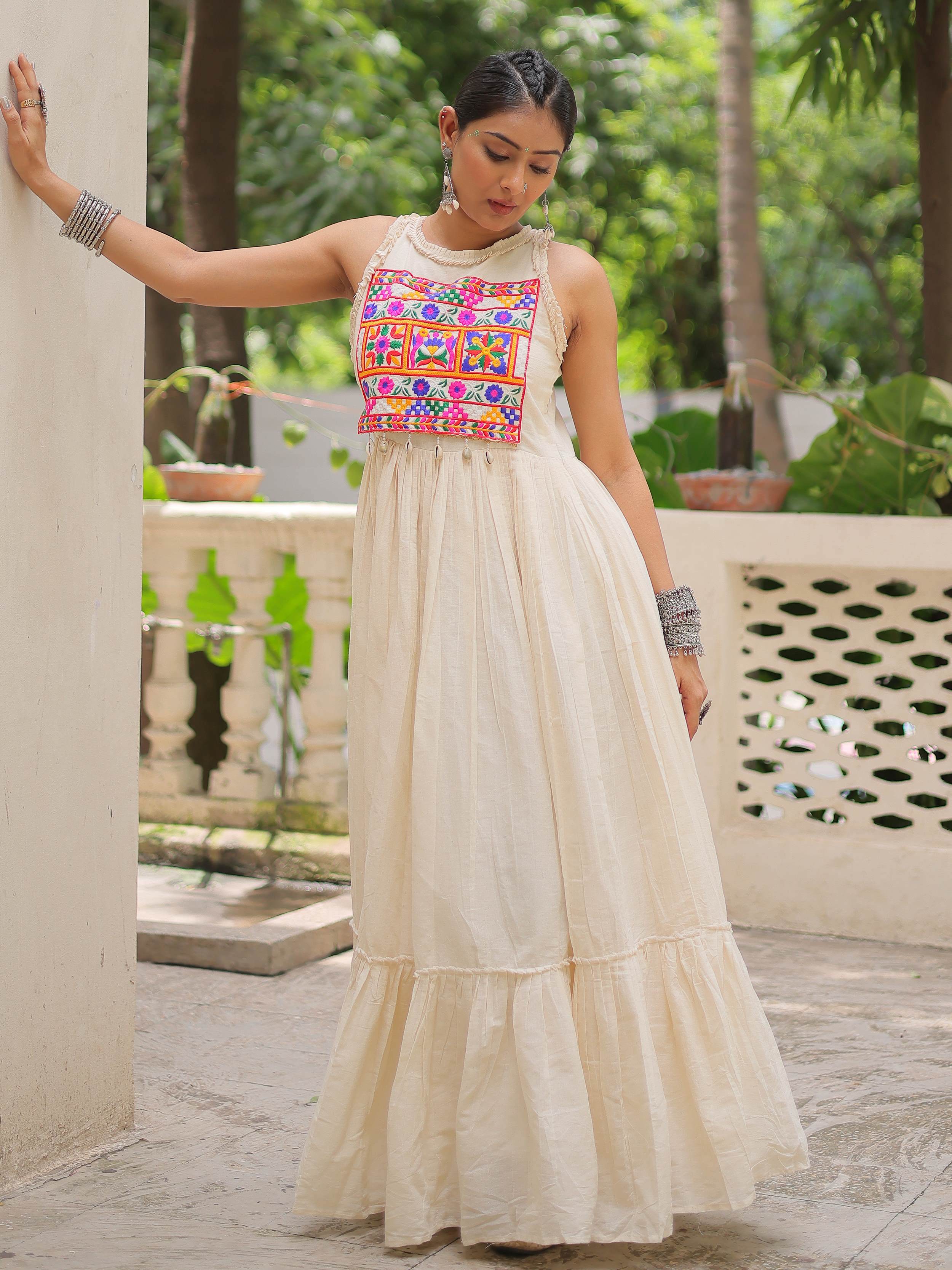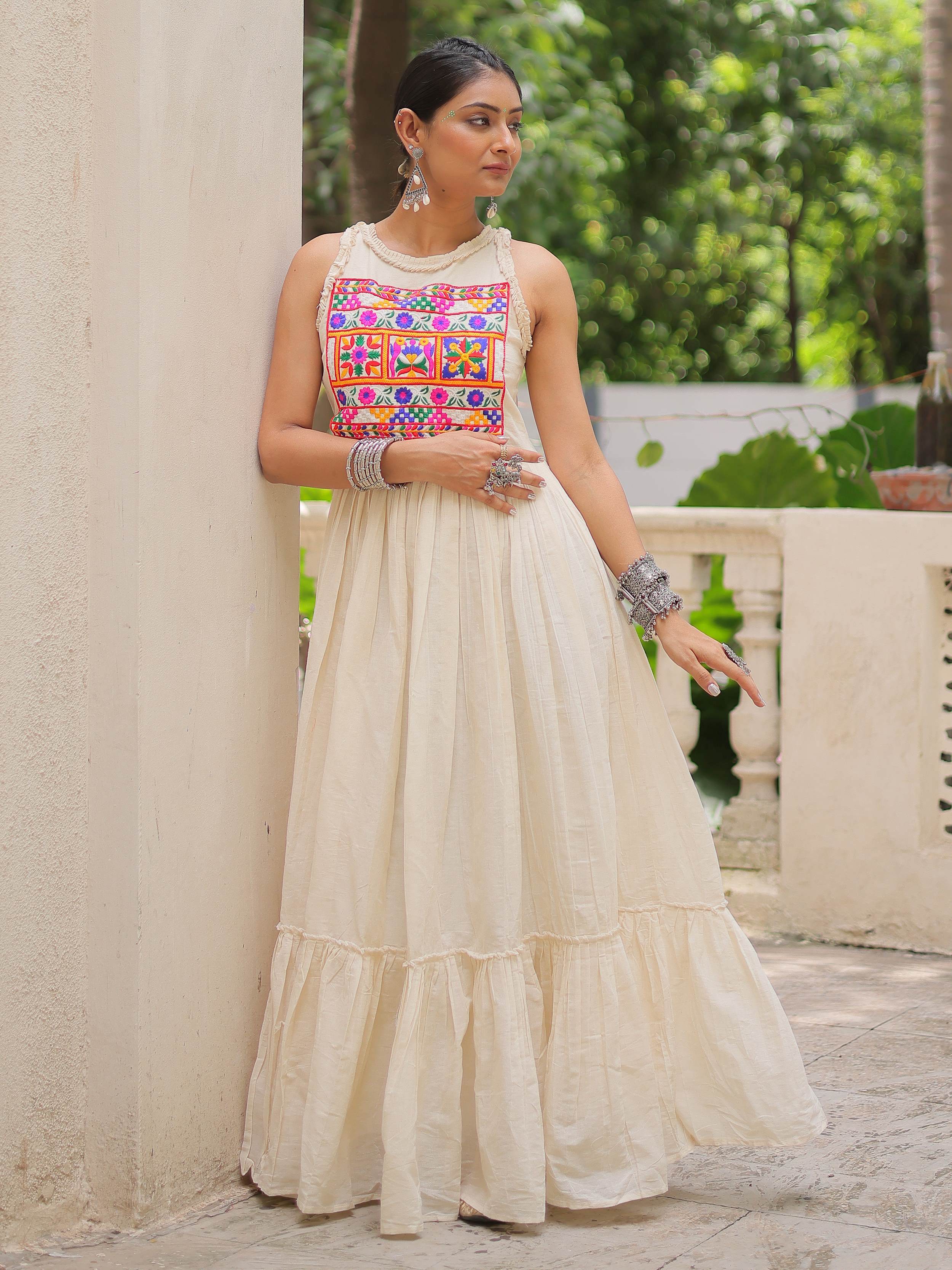 This cotton gown radiates a natural charm with its off-white shade and flowy silhouette, perfect for breezy festive days or casual ethnic outings. The bodice is adorned with vibrant multicolor Kutchi embroidery that adds a striking contrast to the subtle base.