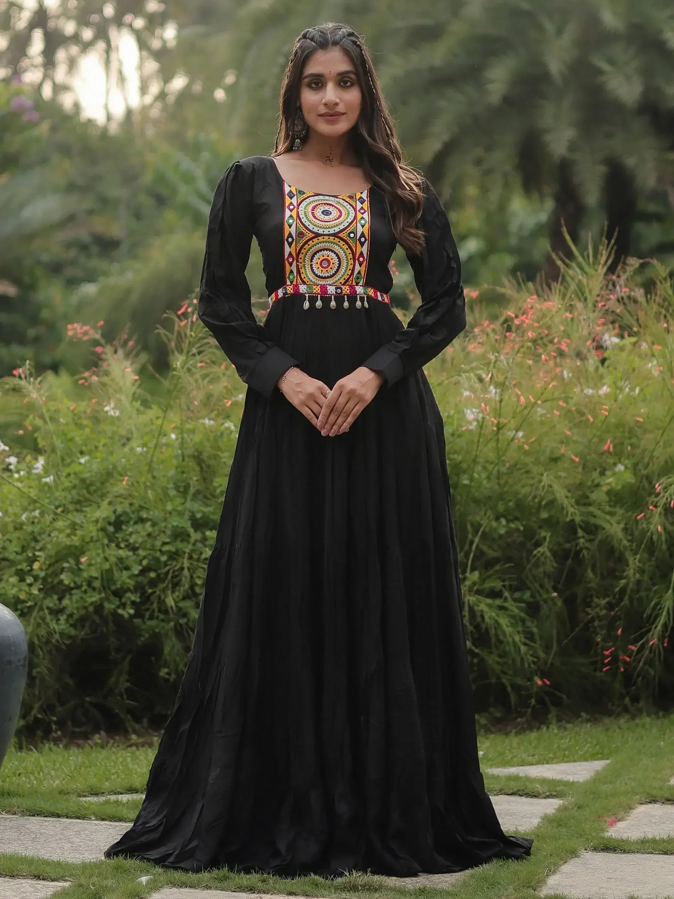 The deep black hue of the gown exudes sophistication and elegance, making it a versatile choice for festivals, weddings, events, or any function where you want to make a lasting impression. The intricate Kutchi Gamthi work, known for its vibrant and detailed embroidery, adds a touch of traditional charm to the gown, making it a standout piece in any wardrobe. The combination of the rich black fabric and the colorful embroidery creates a stunning visual contrast that is both captivating and stylish.