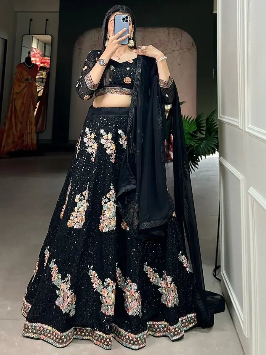 The astonishing black sequins georgette reception wear lehenga choli is the epitome of elegance and sophistication. Its black color, sequin work, and thread embroidery make it a standout piece for any special occasion. Whether it's a wedding, reception, or engagement, this lehenga choli is sure to make you feel beautiful and confident. Crafted with care and attention to detail, it is a must-have addition to every modern woman's wardrobe.