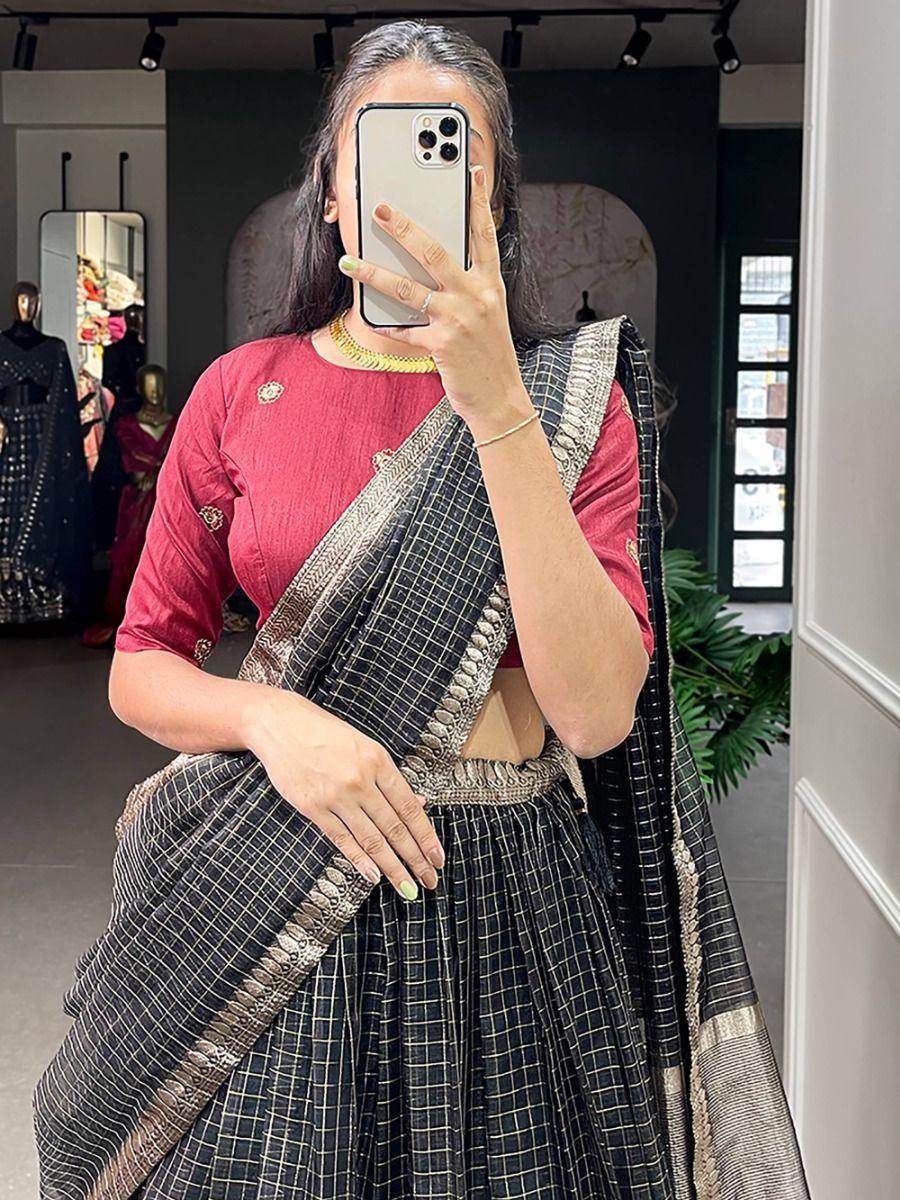 Create your occasional look more impressive by enrobing yourself in this stunning black zari-weaving organza lehenga. The lehenga is crafted with utmost precision and features intricate zari work, adding a touch of elegance and sophistication. The black color adds a sense of mystery and allure to your overall appearance, making you the center of attention at any event.