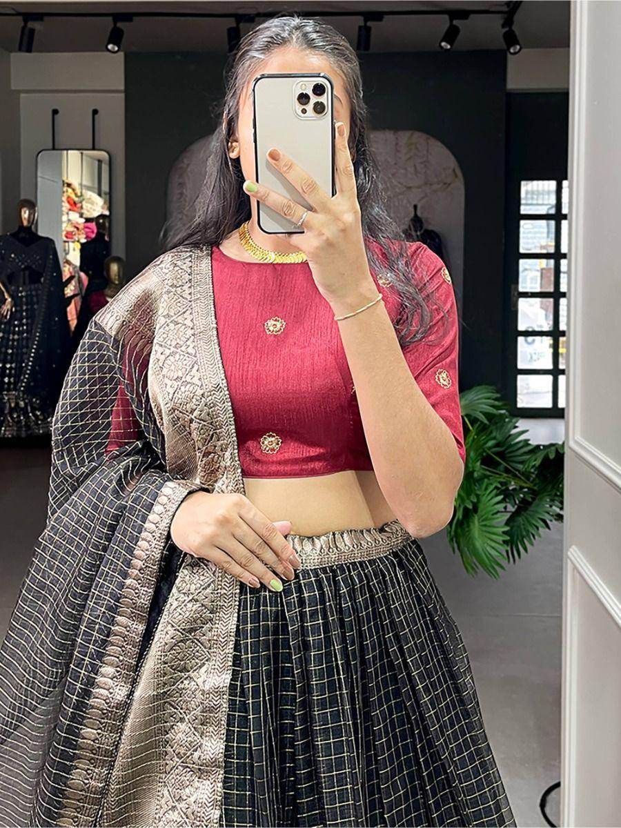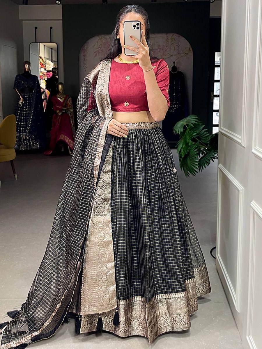 This astonishing black zari-weaving organza lehenga choli is a testament to the rich traditions and craftsmanship of India. It is a blend of contemporary design and traditional artistry, making it a truly unique and exquisite piece. It is an excellent choice for those looking to curate ethnic clothing in style and make a statement with their fashion choices.