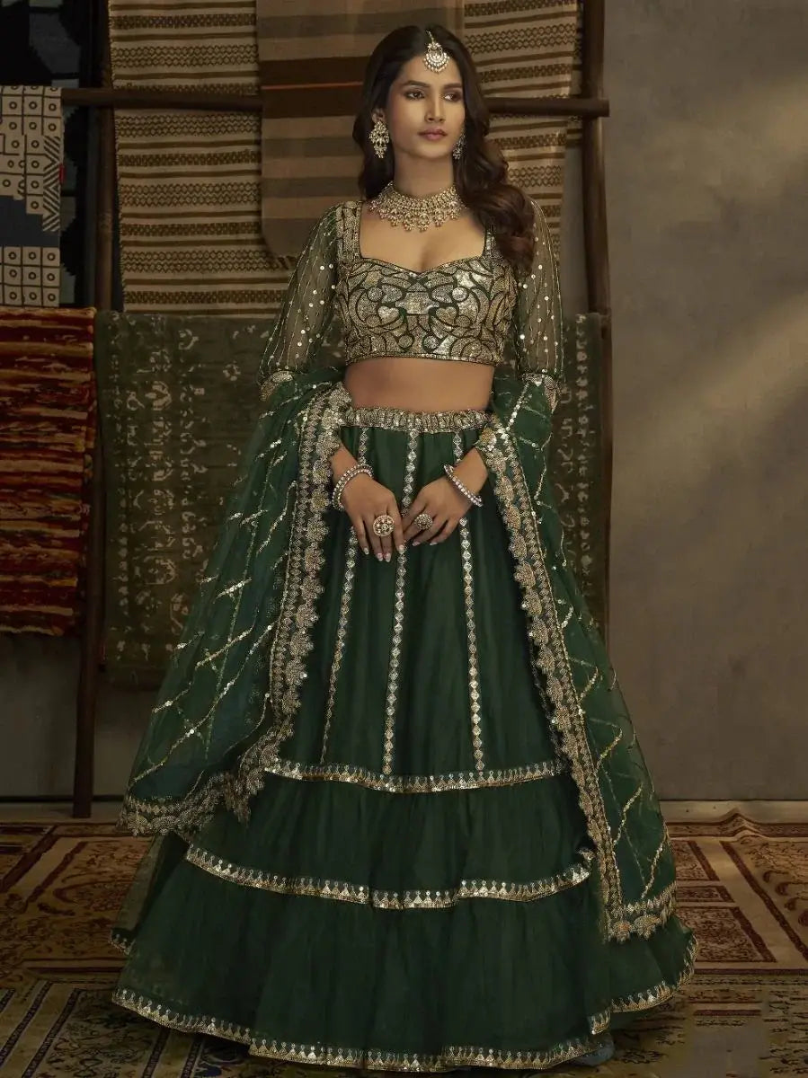 Create your occasional look more impressive enrobing this stunning dark green color lehenga choli. This dark green color lehenga is made of soft net material beautified with zari work, and sequins embroidery.