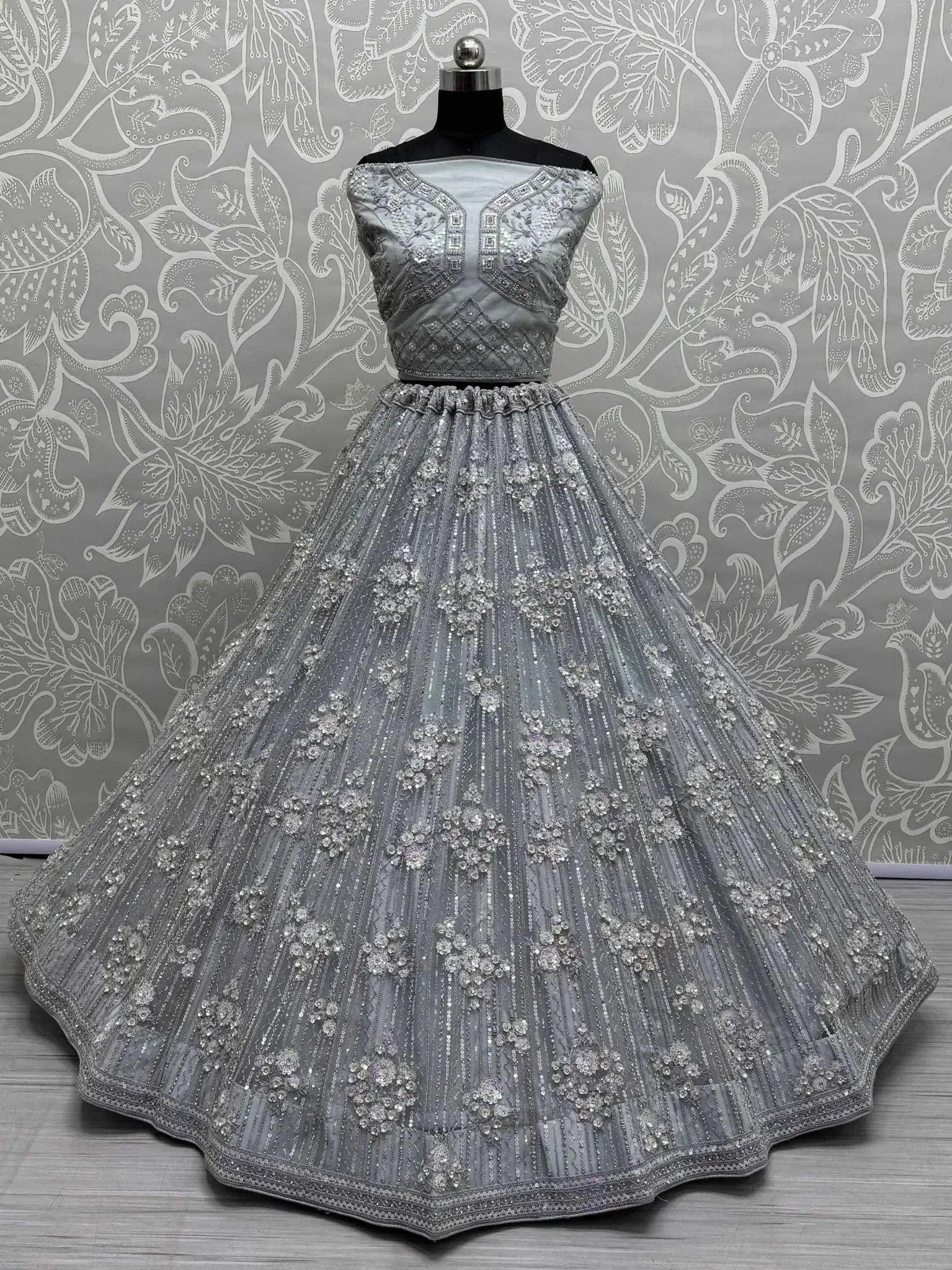 This mesmerizing lehenga includes detailed embroidery, sequin, dori work, zircon, and diamond work that adorn the entire outfit. The net dupatta with four-sided lace borderwork adds a touch of elegance to the ensemble. Whether you're attending a wedding, engagement, or marriage ceremony, this grey lehenga is sure to turn heads and make you the center of attention.