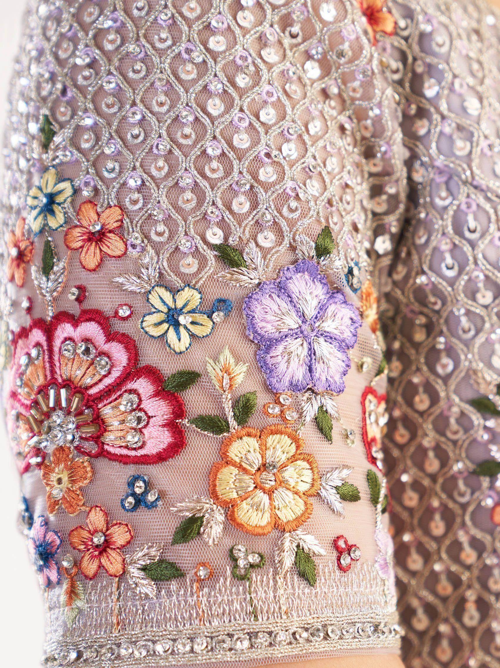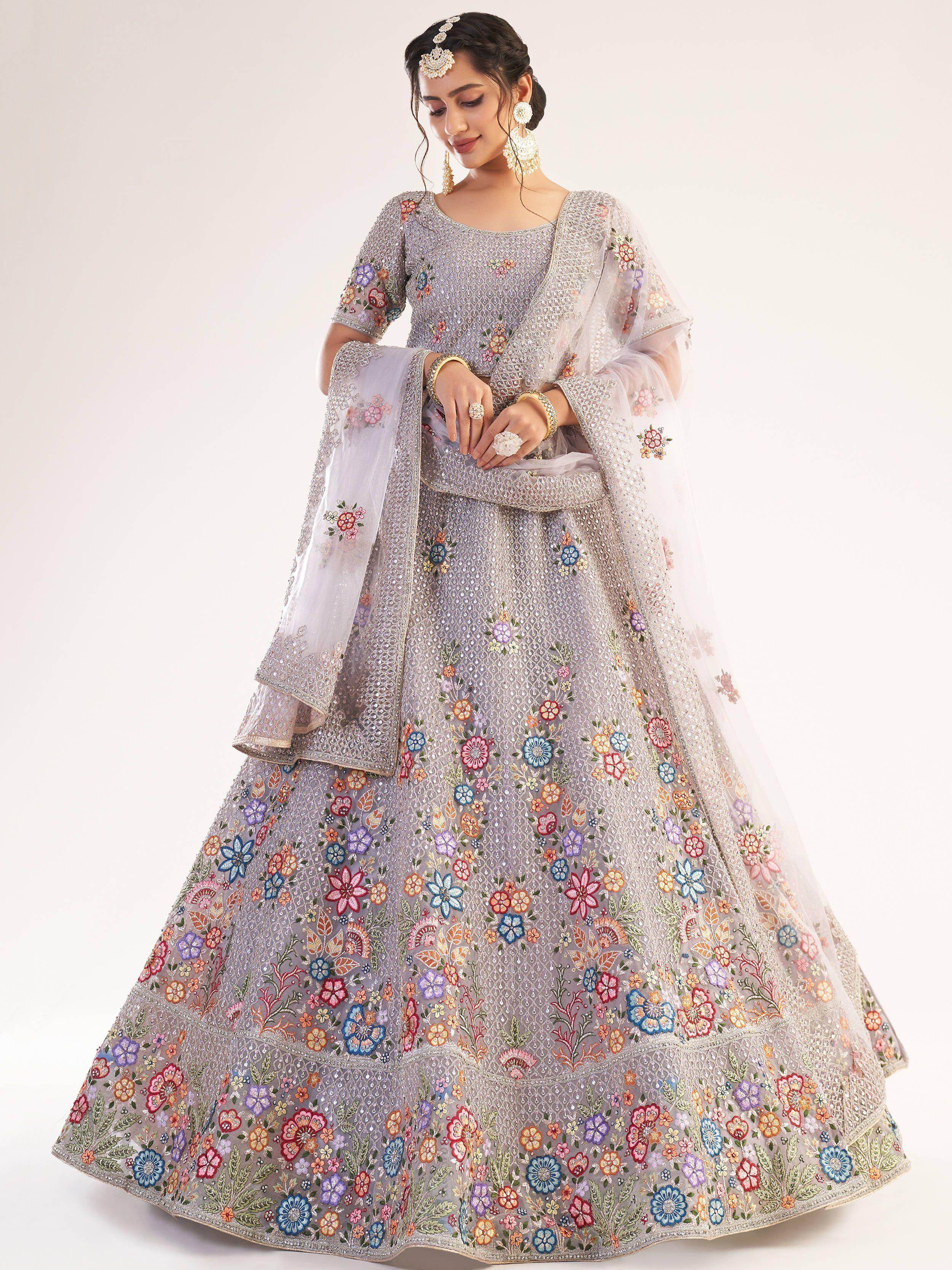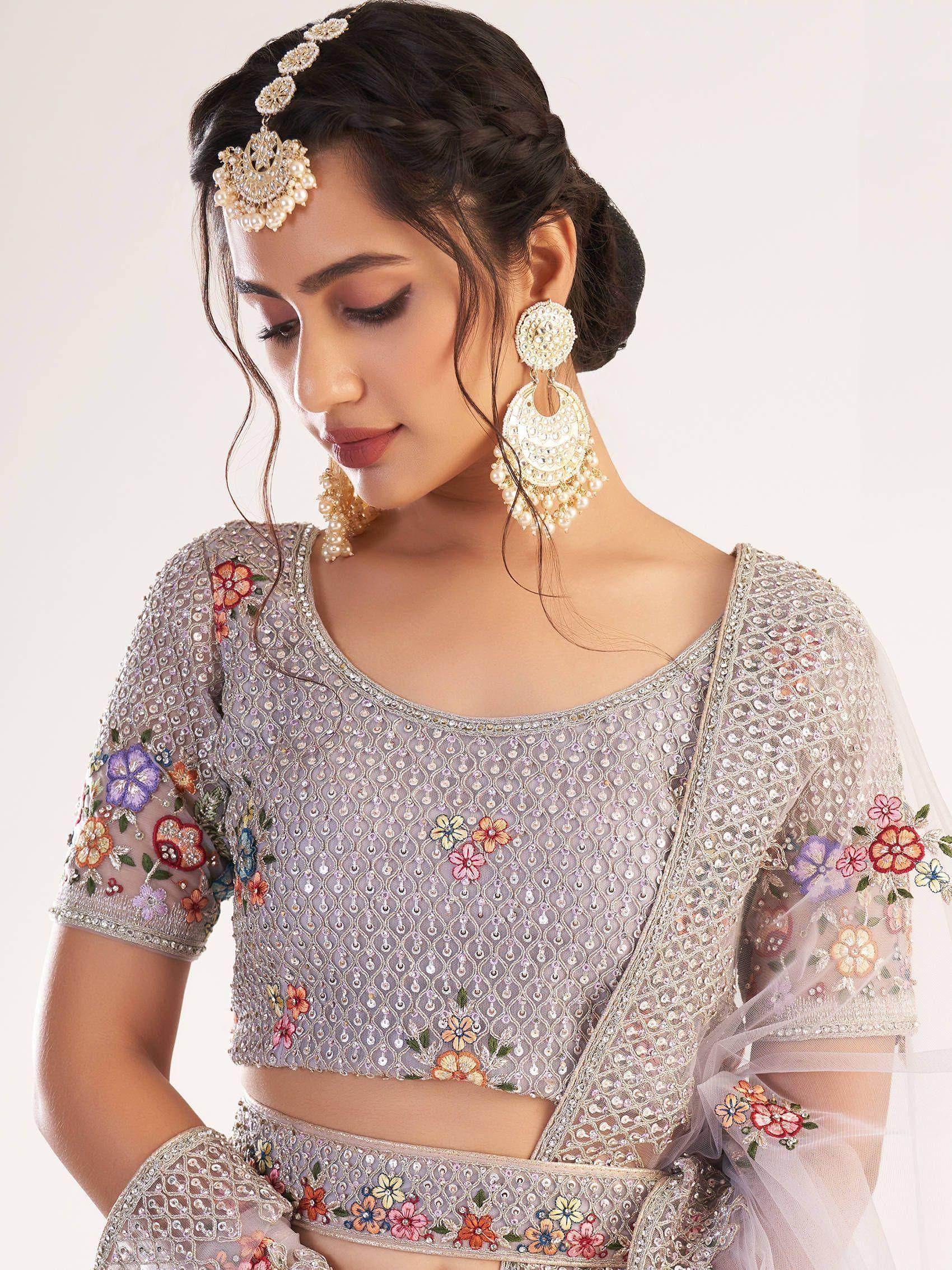 This light purple wedding wear lehenga is semi-stitched can be customized up to 42 inch comes with fully unstitched choli material.