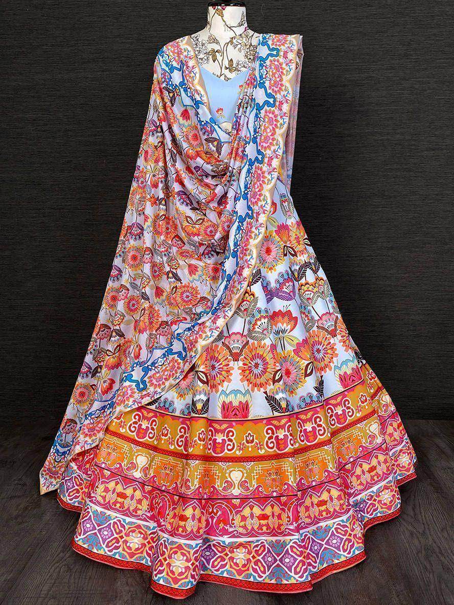 Present an energetic highlight to your ethnic attire by donning this lovely multi-color lehenga in silk material decorated with a hibiscus floral design that comes with an attached can-can inside.