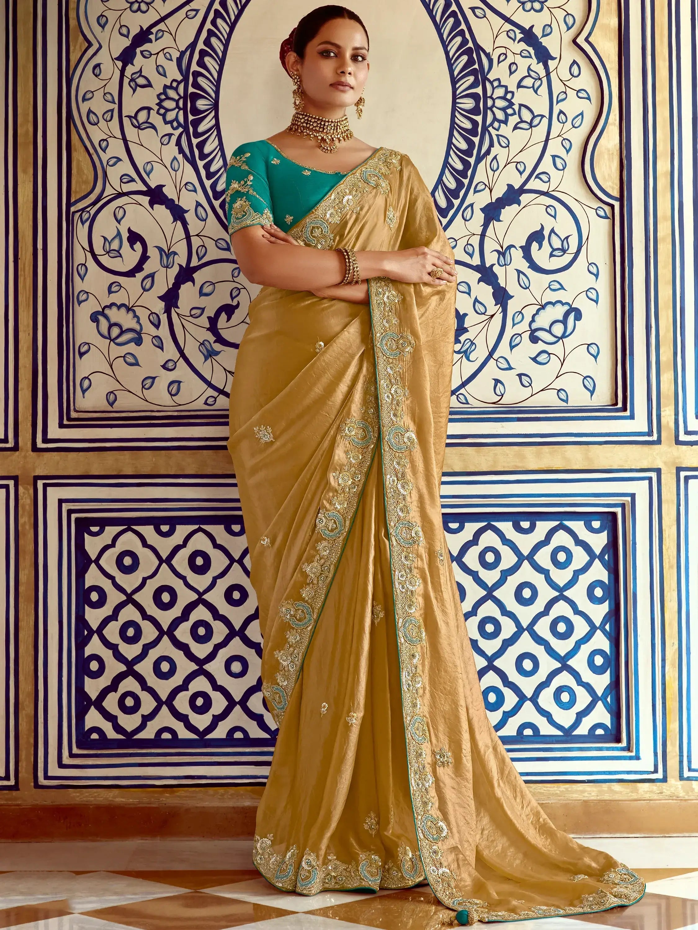 This stunning saree is the perfect choice for those looking to add an ethnic touch to their wardrobe. The mustard yellow color organza saree features intricate sequin, thread embroidered, stone, and pearl work with attractive border detail.