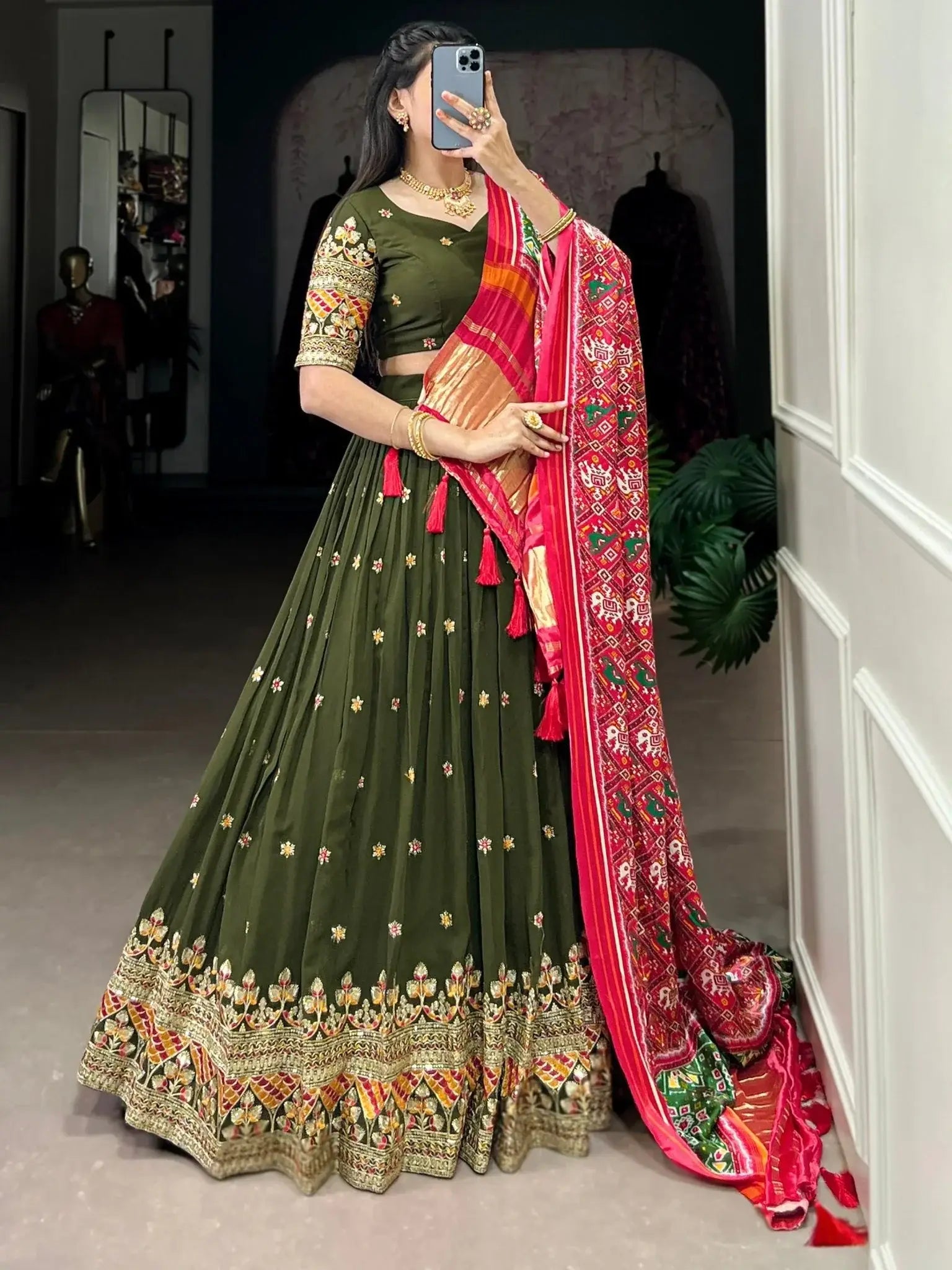 This gorgeous lehenga include its olive green color georgette fabric, detailed thread embroidery, and shimmering sequin work. The maroon georgette dupatta with patola print work adds a vibrant touch to the ensemble, making it a versatile choice for various occasions. The lehenga is comfortable to wear and moves gracefully with every step you take, allowing you to dance the night away in style.