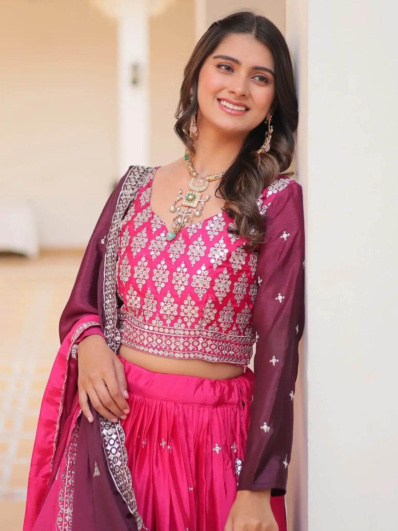 This lehenga choli set includes the high-quality chinon fabric, the stunning pink color that exudes femininity and grace, and the meticulous embroidered and sequin work that adds a touch of sparkle and glamour. The matching choli and dupatta complete the look, giving you a seamless and flawless ensemble that is sure to turn heads wherever you go.