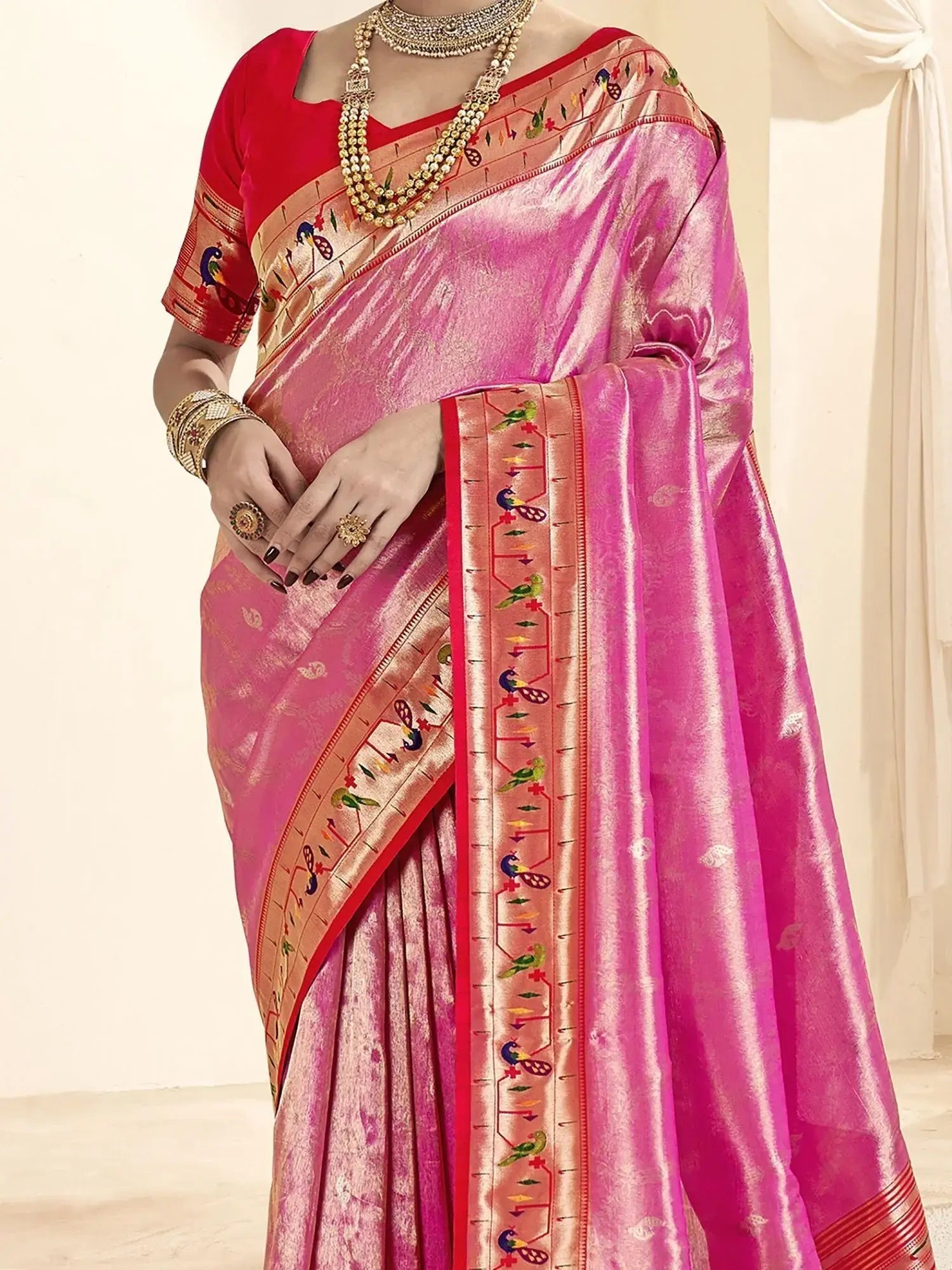 This exquisite pink tissue silk Paithani saree embodies timeless elegance with its intricate zari weaving work and contrasting Paithani border. The saree exudes sophistication, enhanced by the playful addition of attached tassels on the pallu.