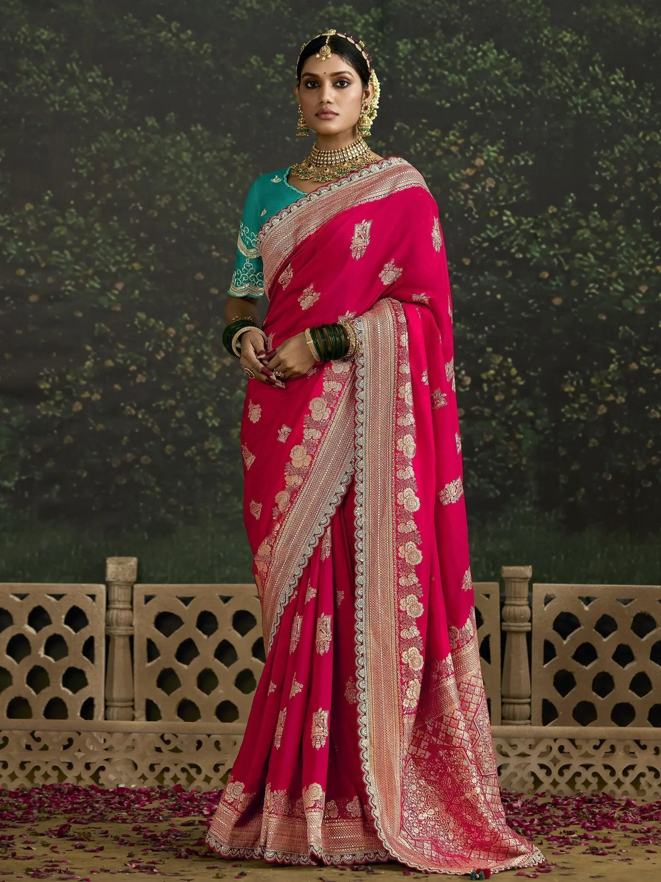 This saree includes a 5.50-meter length, allowing for versatile draping styles, and an unstitched teal green silk blouse material that complements the saree perfectly. The saree is designed to enhance your beauty and grace at any wedding, festival, or marriage ceremony, making you the center of attention wherever you go.