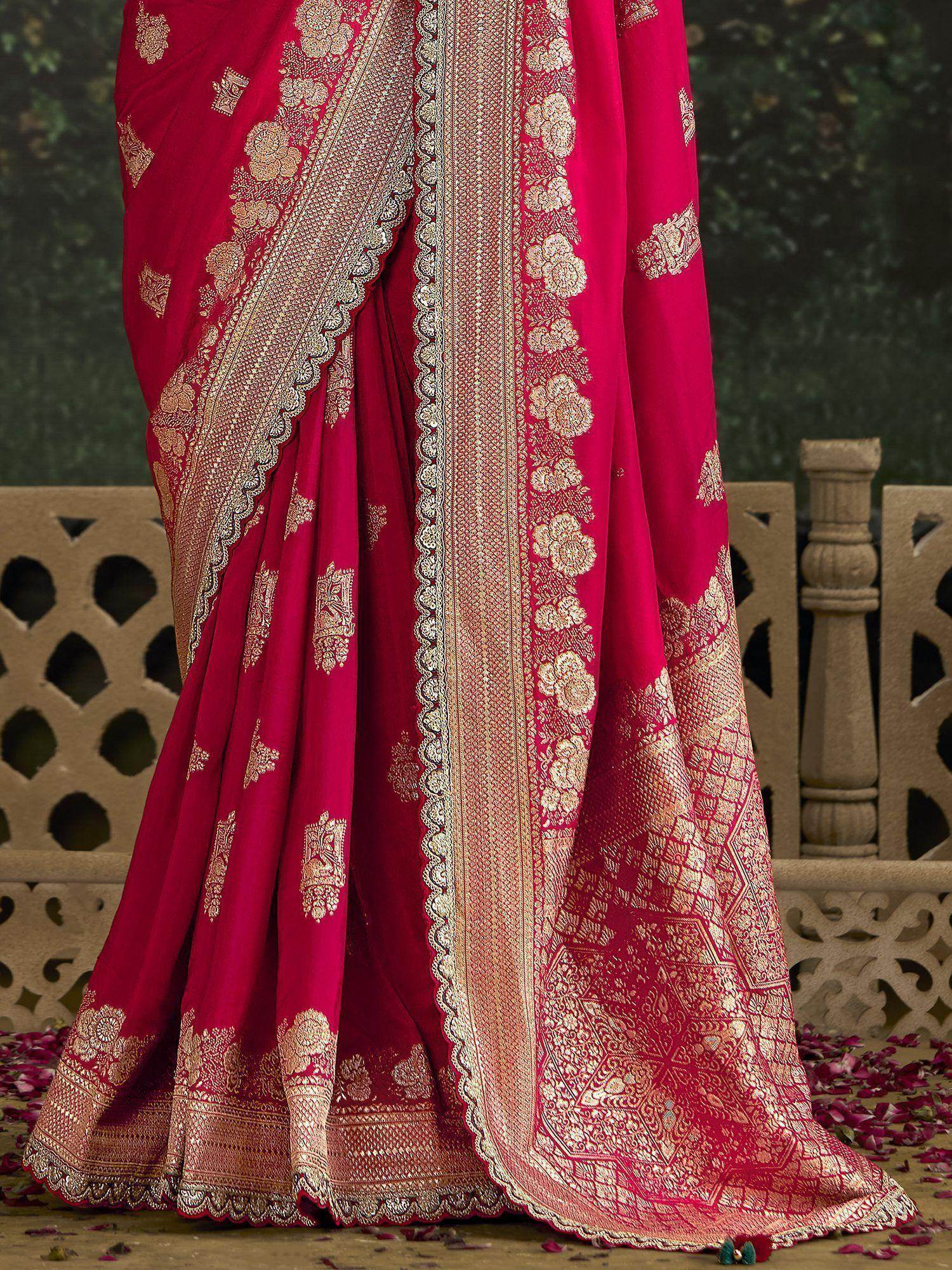 This elegant pink saree is designed in a beautiful pink color with intricate zari weaving and sequin work, making it the perfect choice for creating a traditional ethnic look.