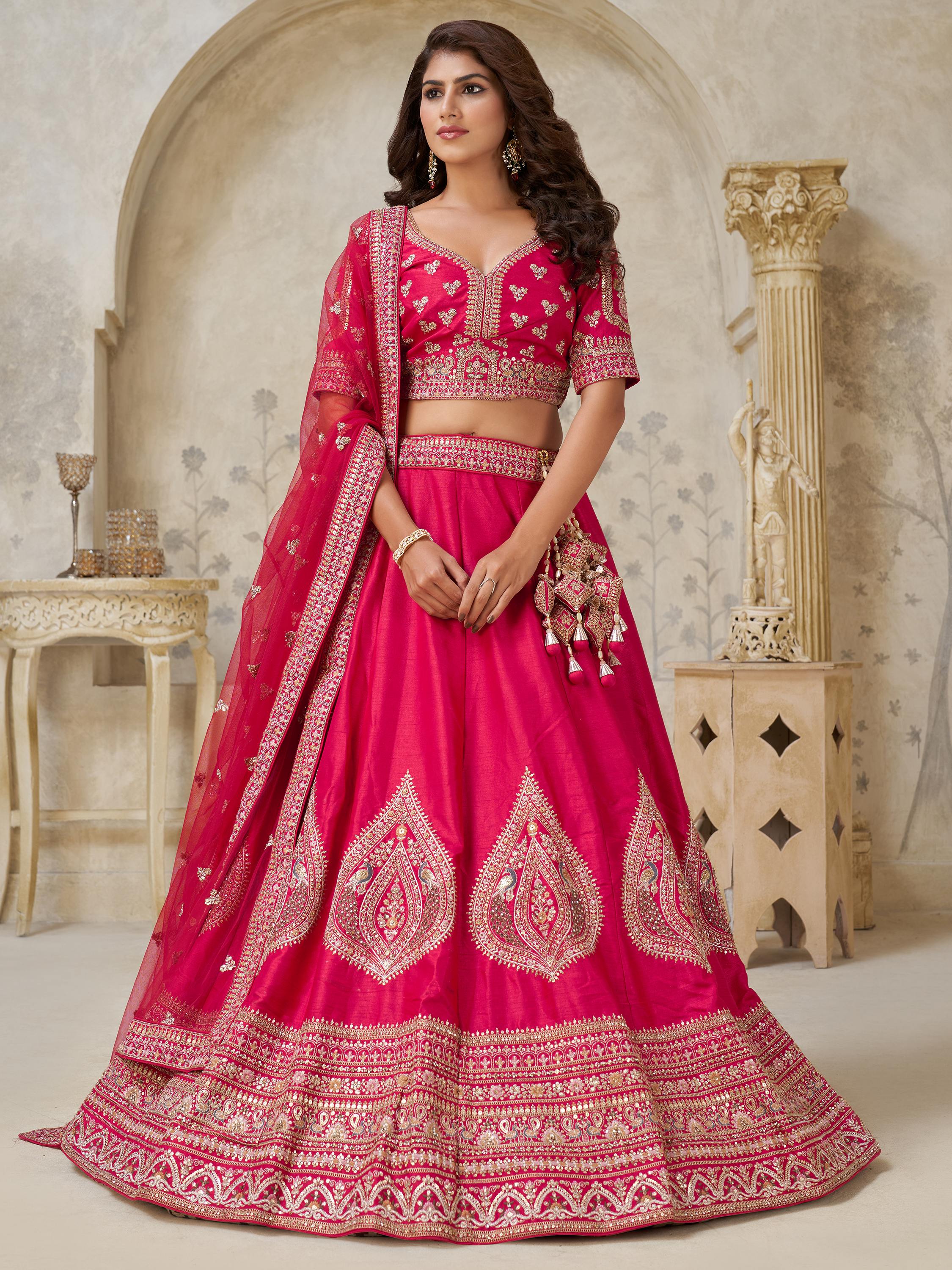 This gorgeous fuchsia pink lehenga radiates festive glamour and timeless elegance. Crafted from luxurious silk fabric, it features intricate zari and sequins embroidery forming paisley and floral motifs across the flare. The broad embroidered border enhances its royal appeal, making it ideal for grand occasions.