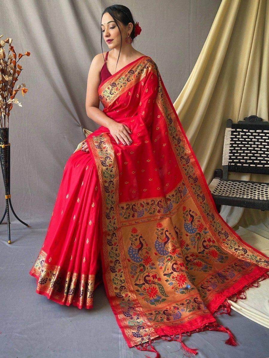 Introducing the astonishing red zari weaving paithani silk festival wear saree, a must-have addition to your ethnic collection. This stunning saree is made from high-quality silk material in a vibrant red color, adorned with tiny peacock motifs all over the body. The saree features a gold with meenakari zari woven border, adding a touch of elegance to its design. The rich paithani woven pallu further enhances its beauty, making it a perfect choice for Indian festivals, events, weddings, and receptions.