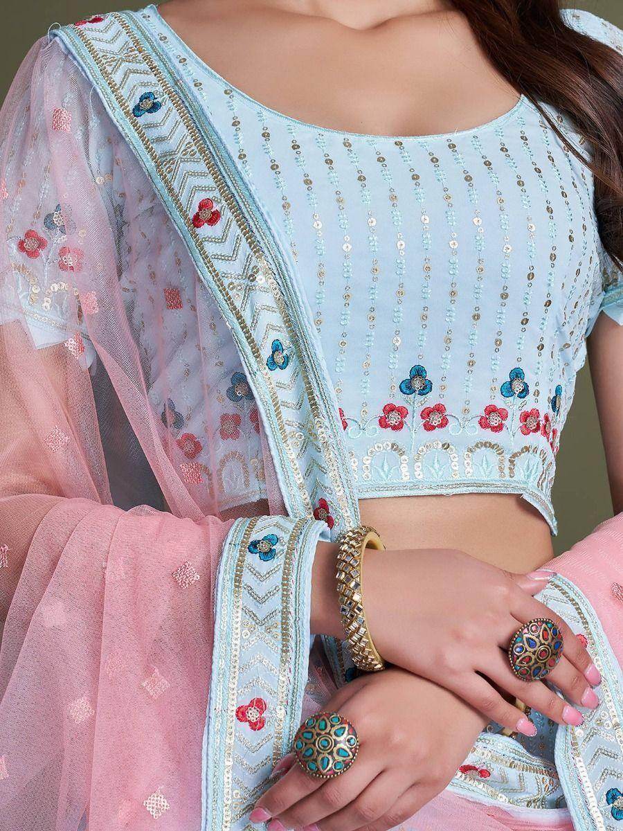 This lehenga comes with a contrasting in baby-pink net dupatta with sequins work and contrasting sky blue color lace with embroidery and a matching blouse with the same work on georgette.