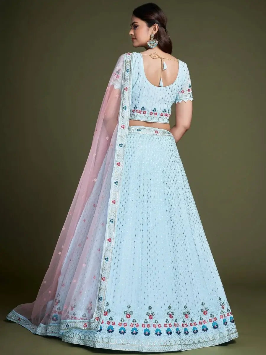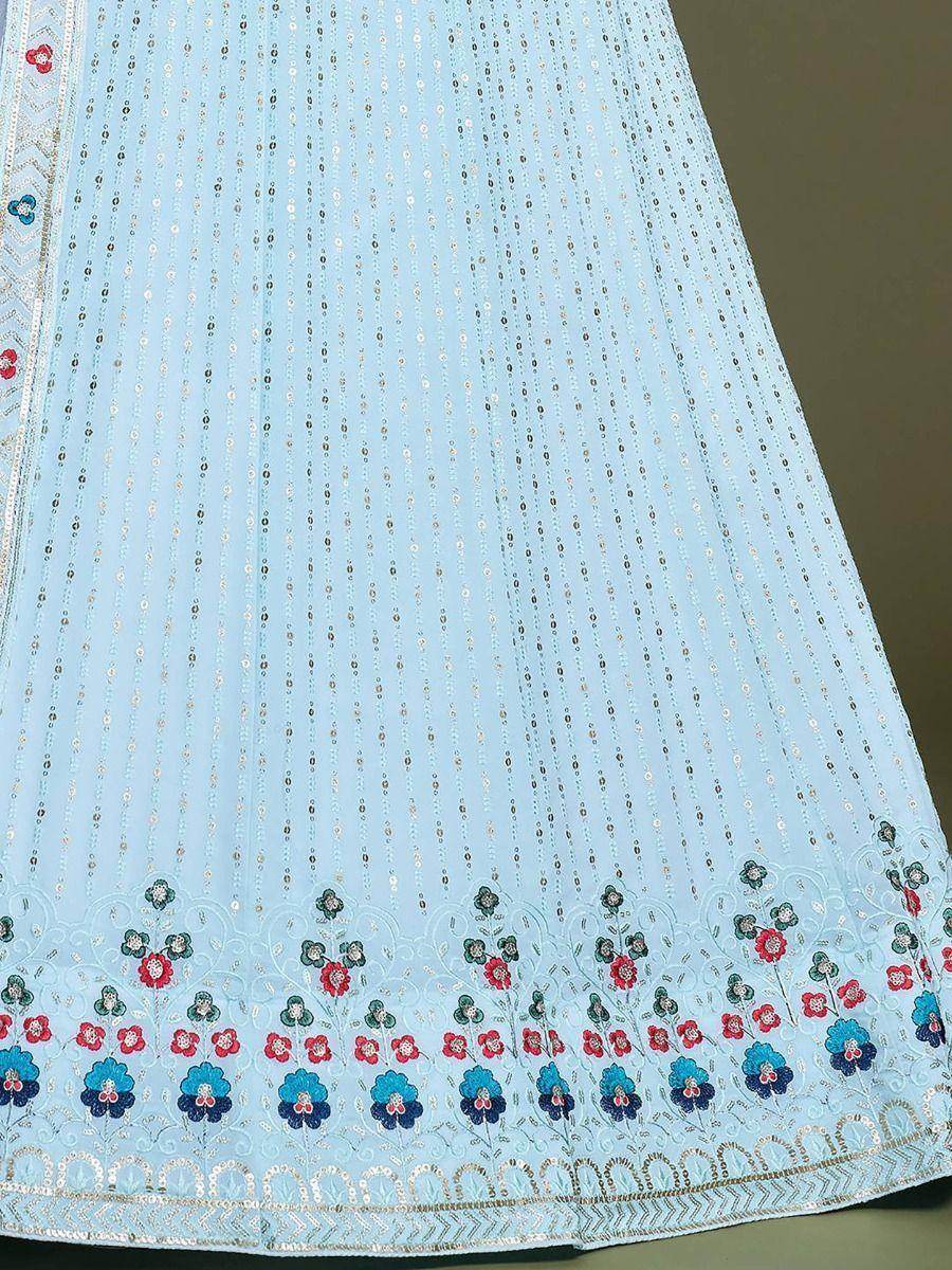 Walk in grace and up your standards wearing this eye-captivating sky-blue Sequins Embroidered Georgette Lehenga. It features beautiful sequence work all over that is difficult to take eyes off.