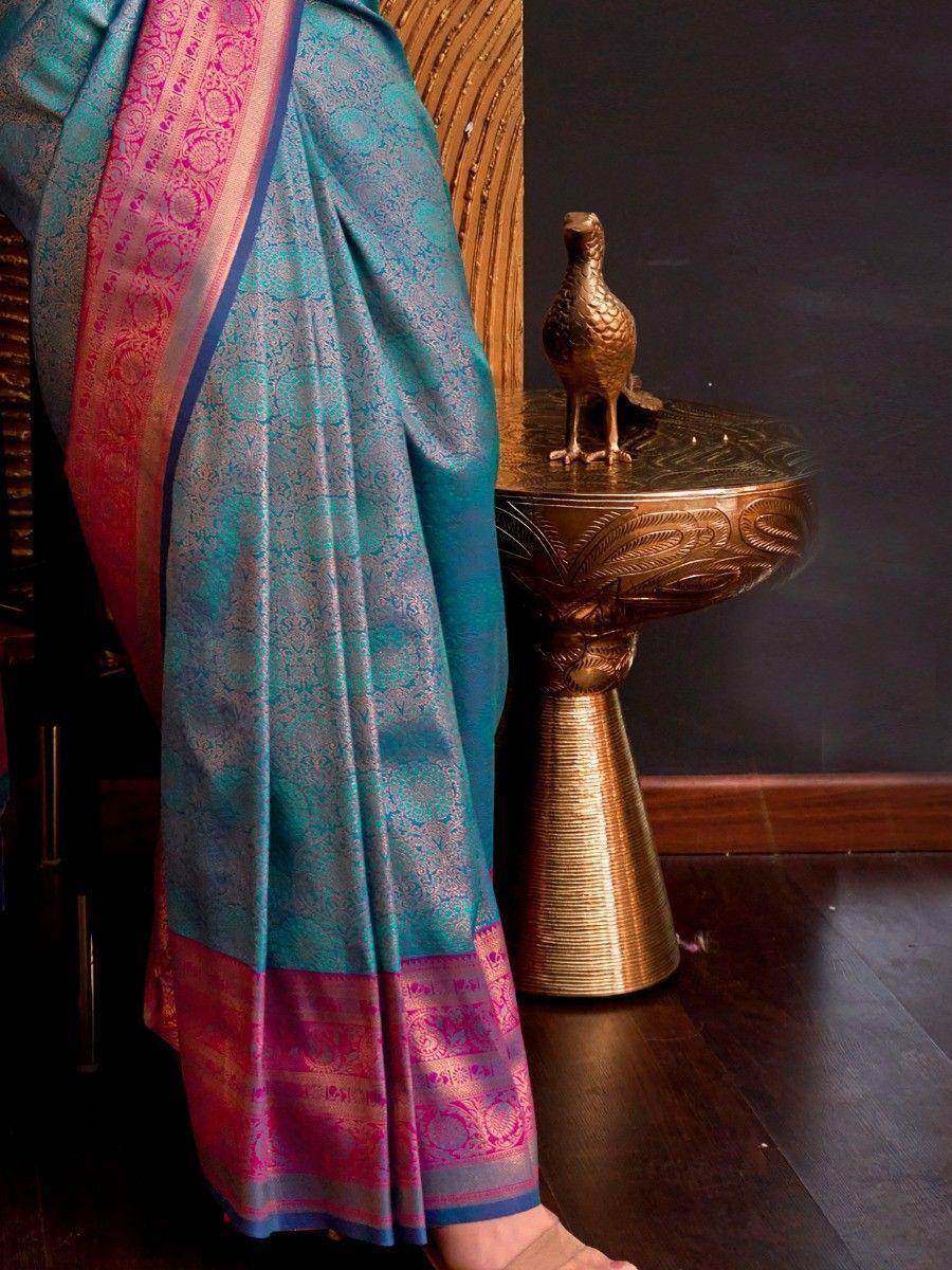 The sky-blue color of this saree adds a touch of elegance and sophistication. The silk material ensures a smooth and comfortable feel, making it a pleasure to wear. The intricate weaving work on the saree enhances its beauty and gives it a unique and eye-catching look. It adds a touch of glamour and makes you feel like a true queen.