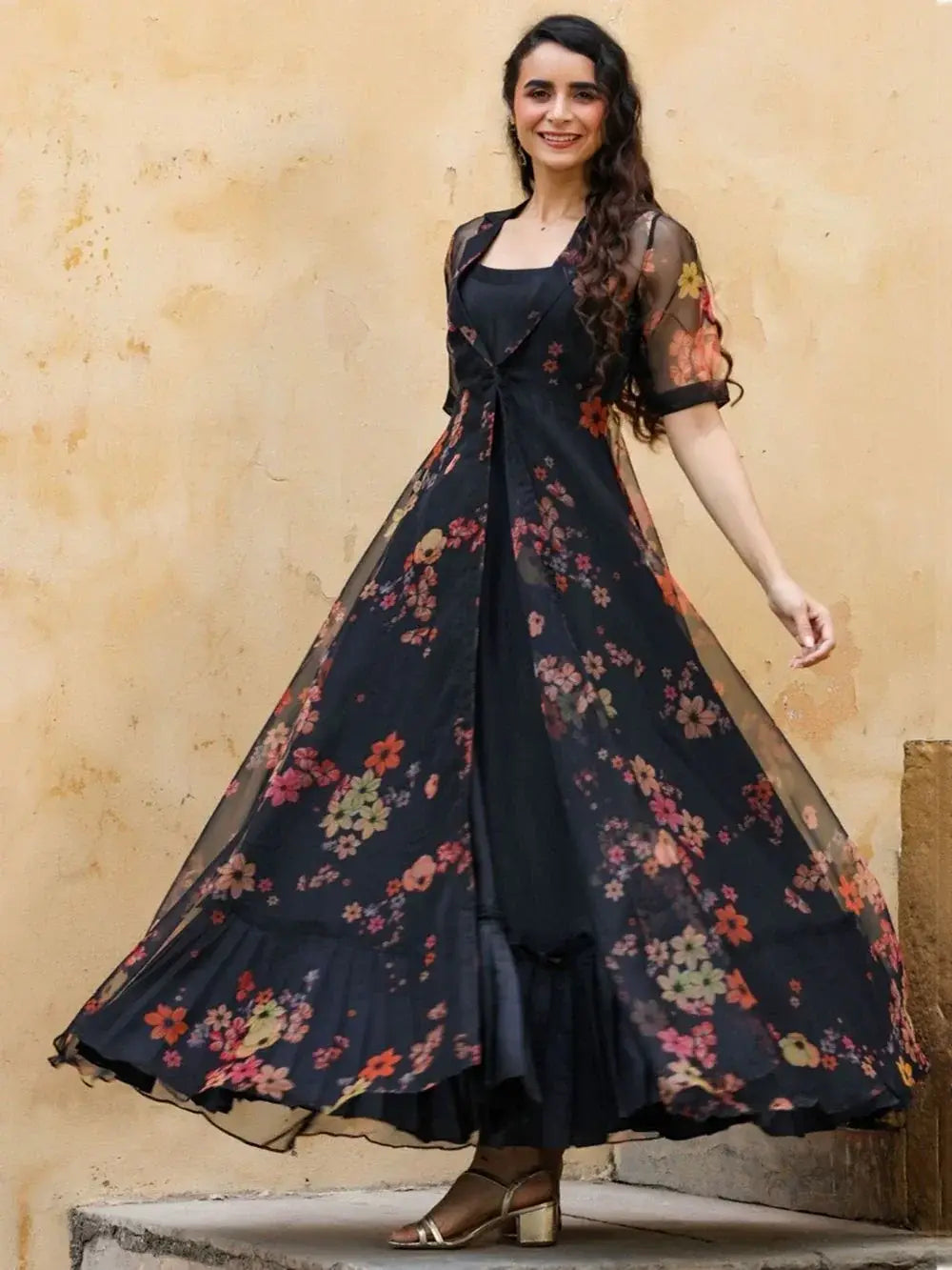 This astounding black rayon party wear plain gown with printed koti is not just a dress, it's a statement piece that exudes confidence and poise. The flower print detailing adds a whimsical touch to the overall design, making it a unique and eye-catching choice for any occasion. Whether you're attending a festival, party, or special event, this gown is sure to make you the center of attention.