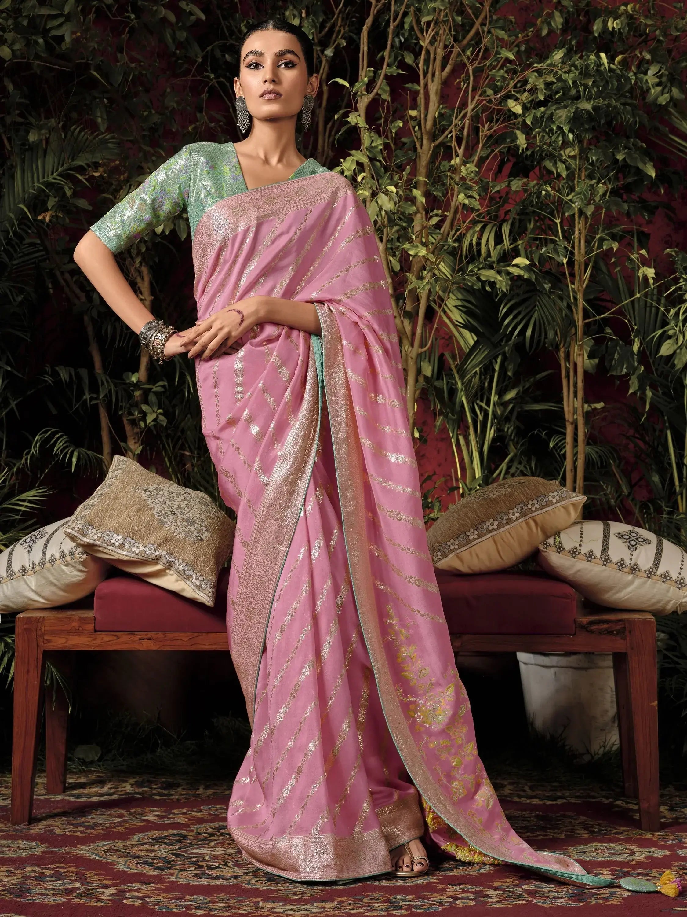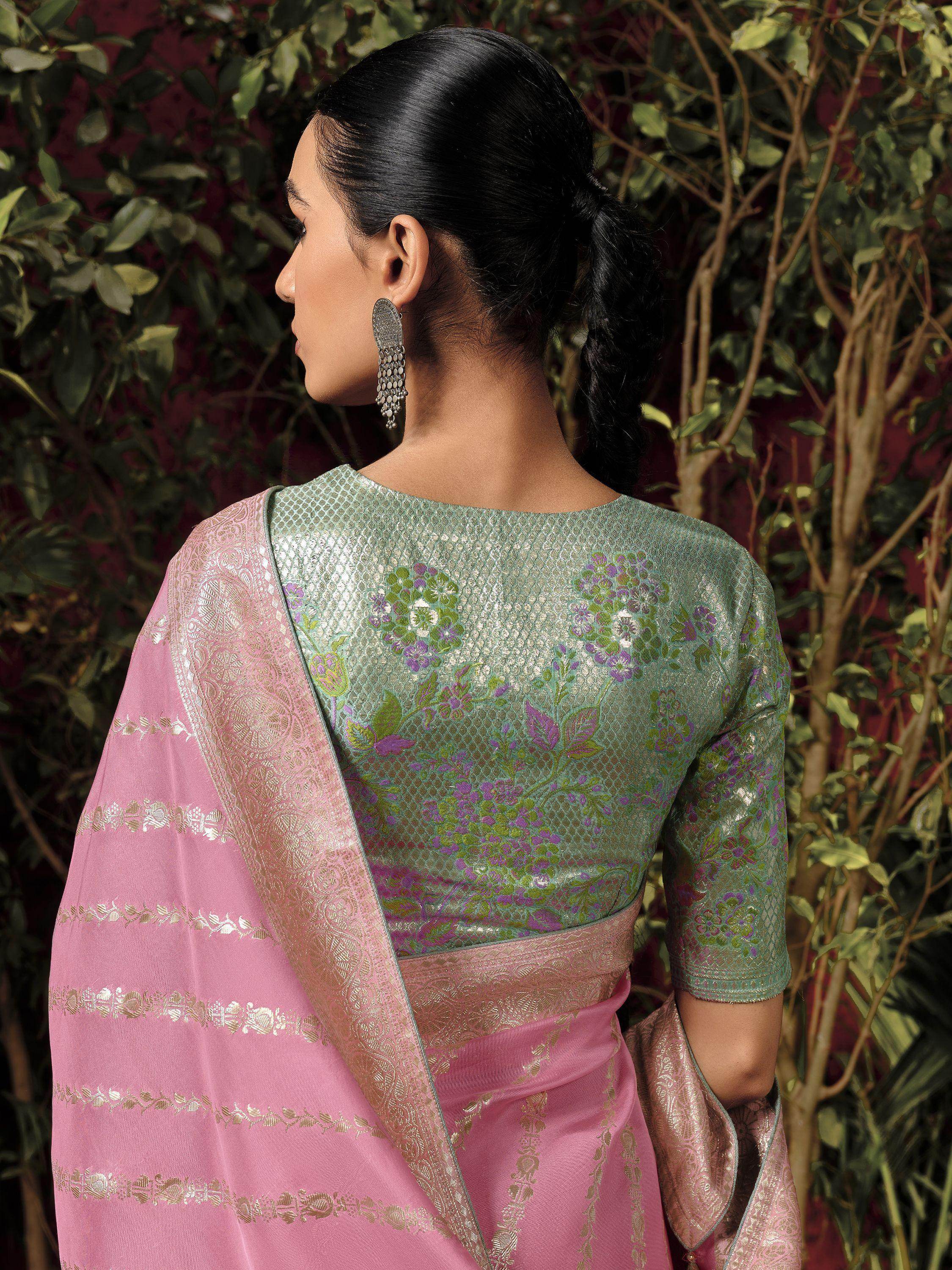 This saree is the attention to detail in the zari-weaving design, which adds a luxurious and traditional touch to the overall look. The pink silk blouse with zari weaving work perfectly complements the saree, creating a cohesive and stylish ensemble. The unstitched blouse material allows for customization to ensure the perfect fit for your body shape and size.