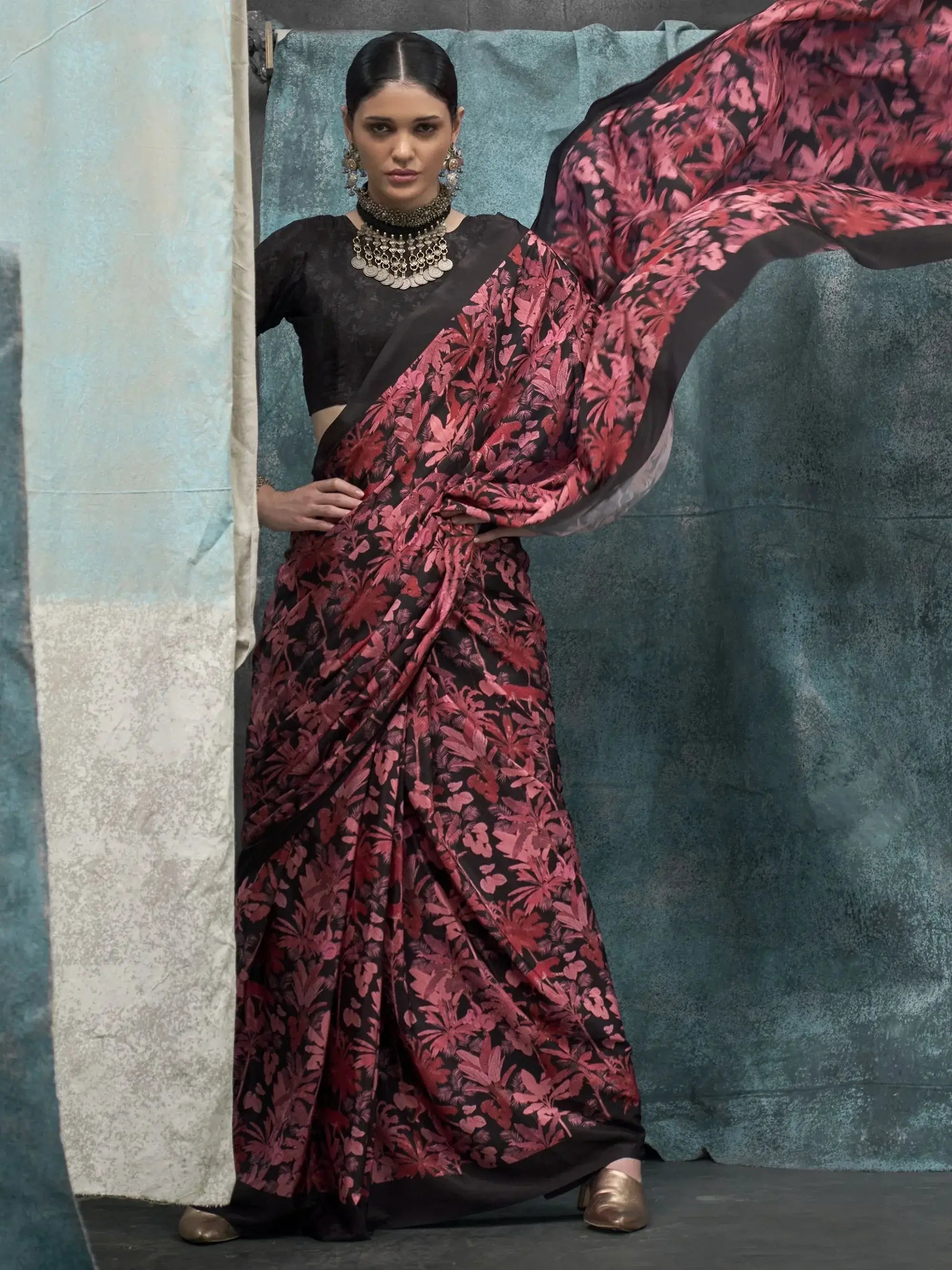 The black crepe fabric of the saree exudes a timeless appeal, providing a luxurious drape that flatters every body type. The digital prints, skillfully incorporated into the design, bring a modern twist to this traditional attire. Vibrant multi-color patterns dance across the black canvas, creating a visually captivating effect that is sure to turn heads. Each print is meticulously executed, ensuring that the colors remain vivid and the patterns sharp, even after multiple wears.