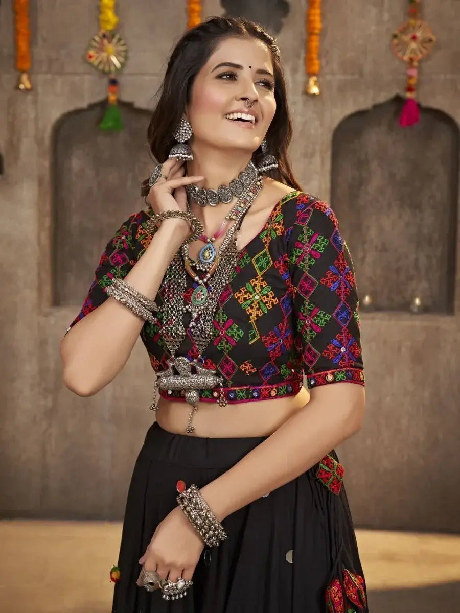 The attractive black embroidered rayon Navaratri wear lehenga choli offers numerous benefits that will enhance your overall look and make you feel confident and stylish. Its exquisite design and high-quality fabric ensure that you will stand out in any crowd. Whether you are attending a Navaratri wedding, festival, or marriage ceremony, this lehenga choli is the perfect choice to make a lasting impression.