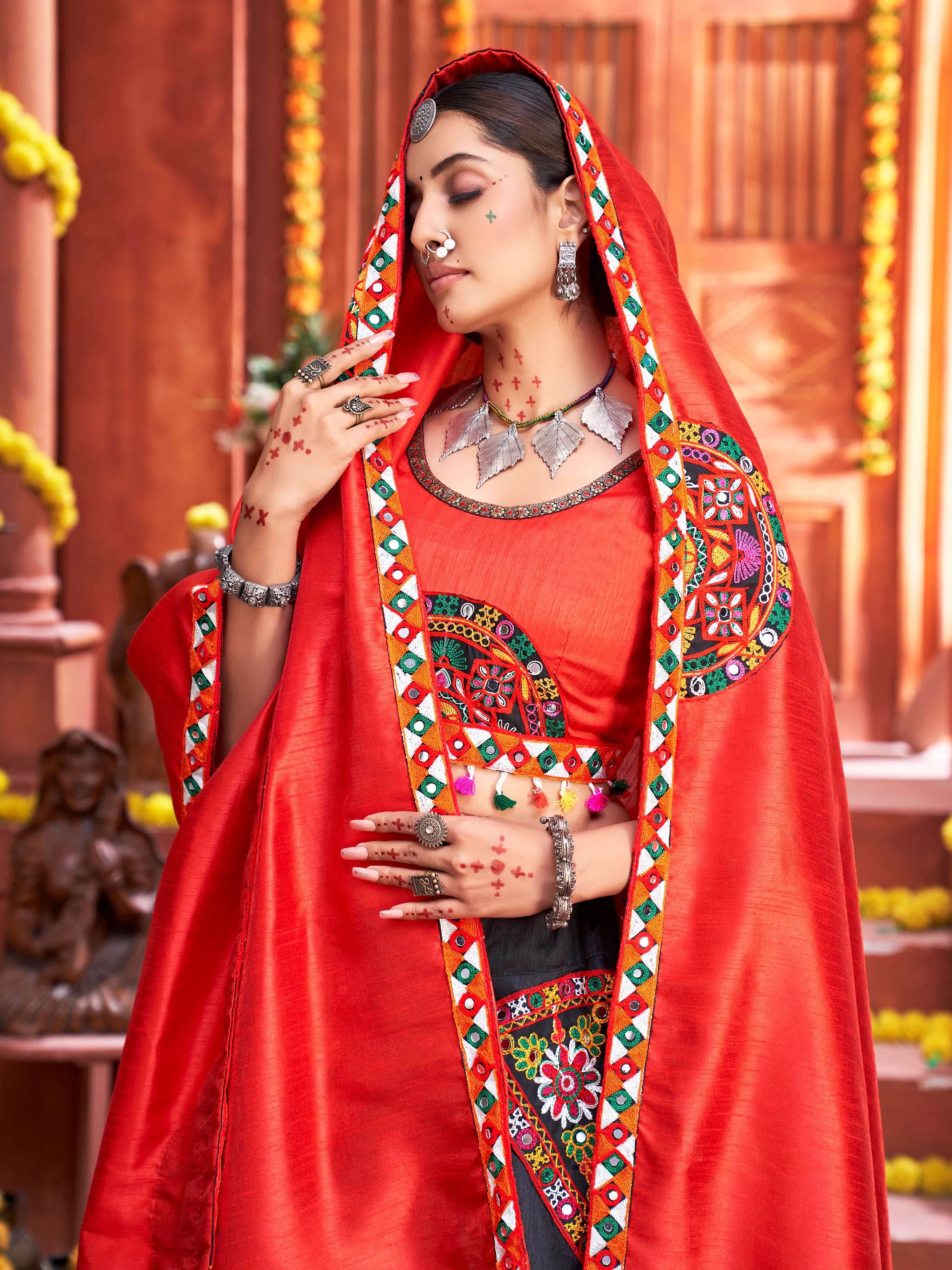 Comes with a red color boat neck design and half sleeve precious silk fabric choli embellished with pach butta and all-over real mirror work and red color silk fabric dupatta adorned with desirable lacework (2.3 mtr)