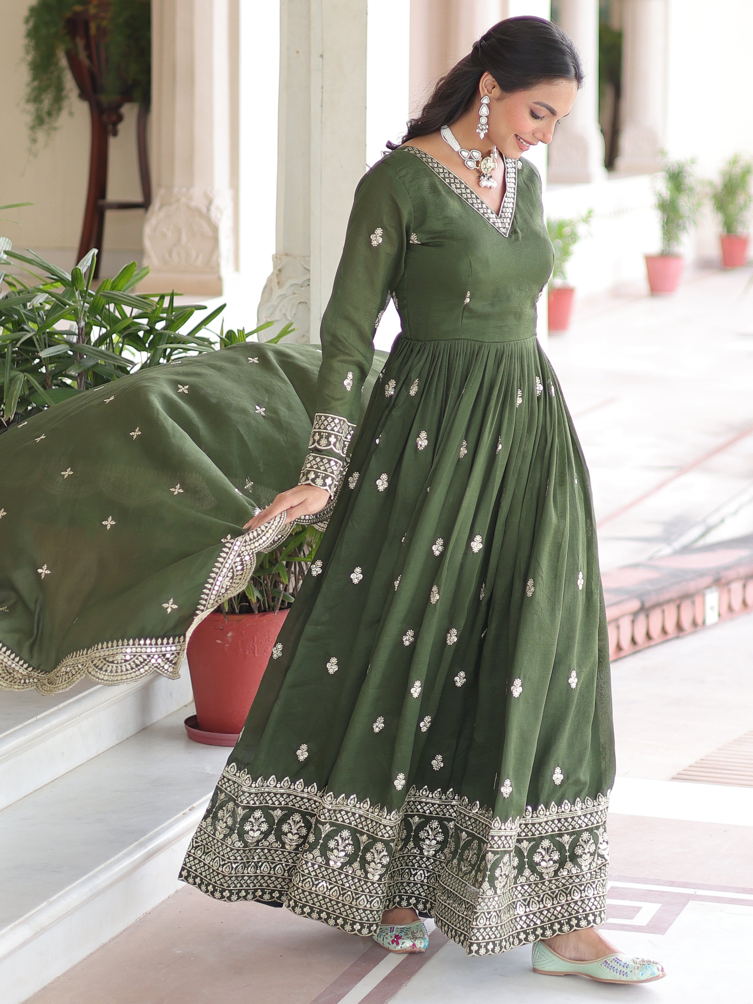The model is wearing a rich Olive Green Vichitra Silk gown featuring luxurious sequins and zari embroidered work that adds a royal glow. This stitched gown comes with a Fancy V-neck, full sleeves, and canvas patta finishing for a beautifully structured fall.