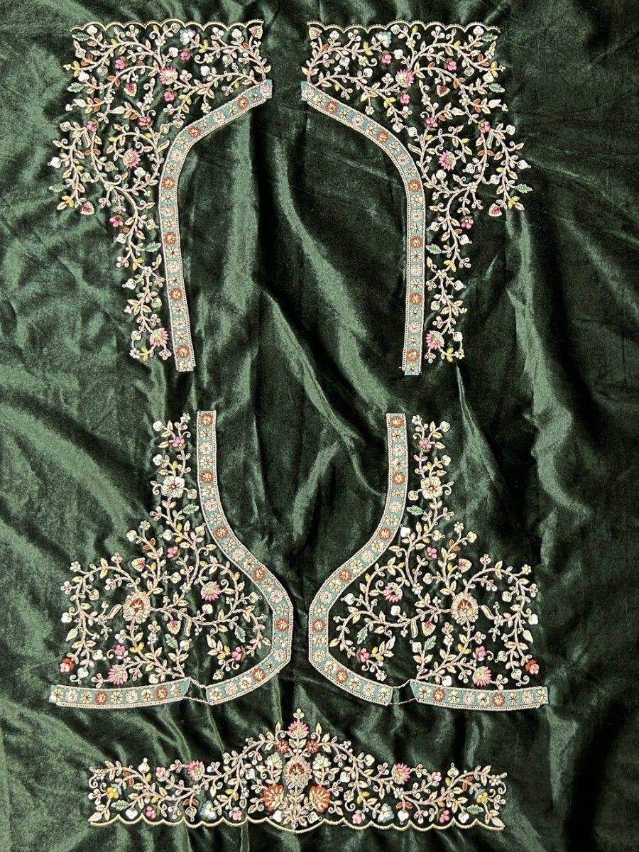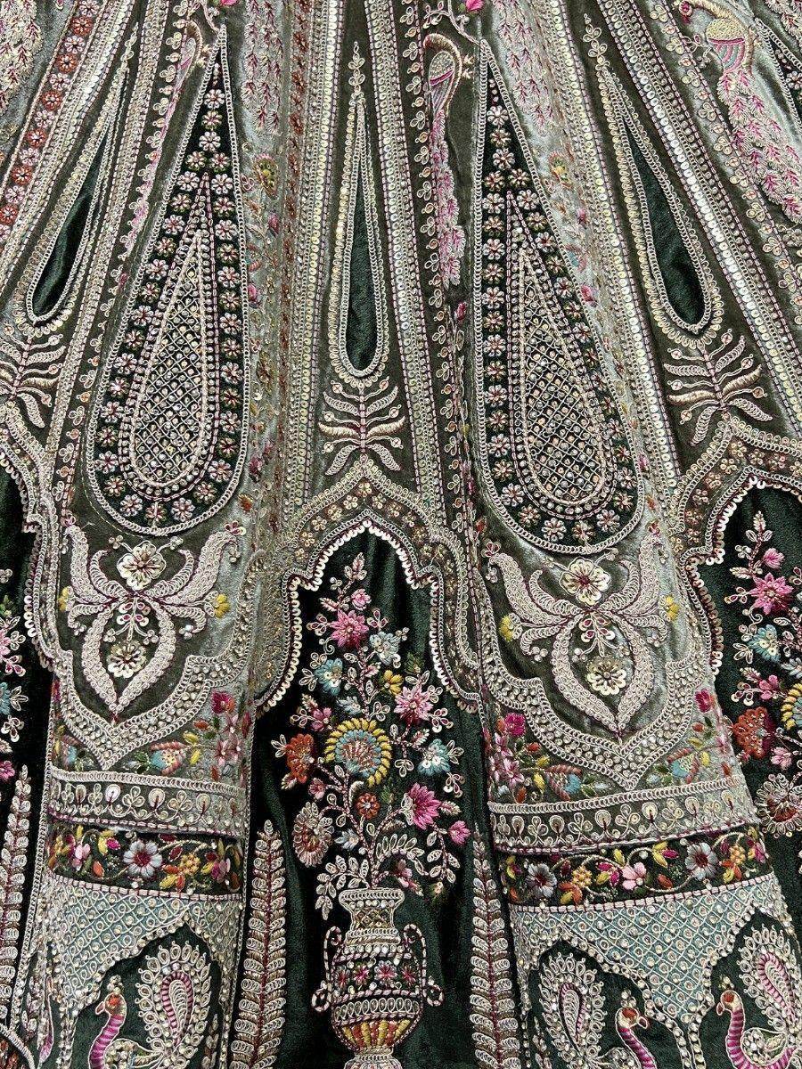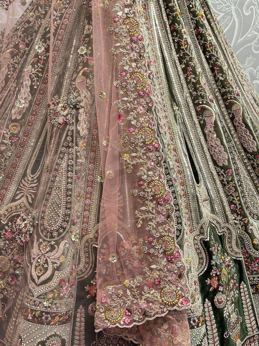 Crafted with utmost care, this stunning bridal lehenga features a beautiful green color velvet material adorned with exquisite embroidered work, fancy dori work, multi-thread work, sequin work, and diamond work. The intricate embroidery and embellishments add a touch of elegance and glamour, making you the center of attention on your big day.
