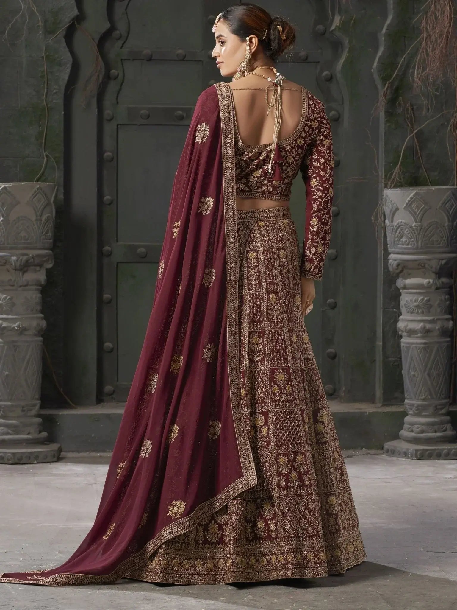 The matching maroon choli, crafted from georgette material, is embellished to mirror the lehenga's intricate design. This ensures a cohesive and luxurious appearance, ideal for the bride.