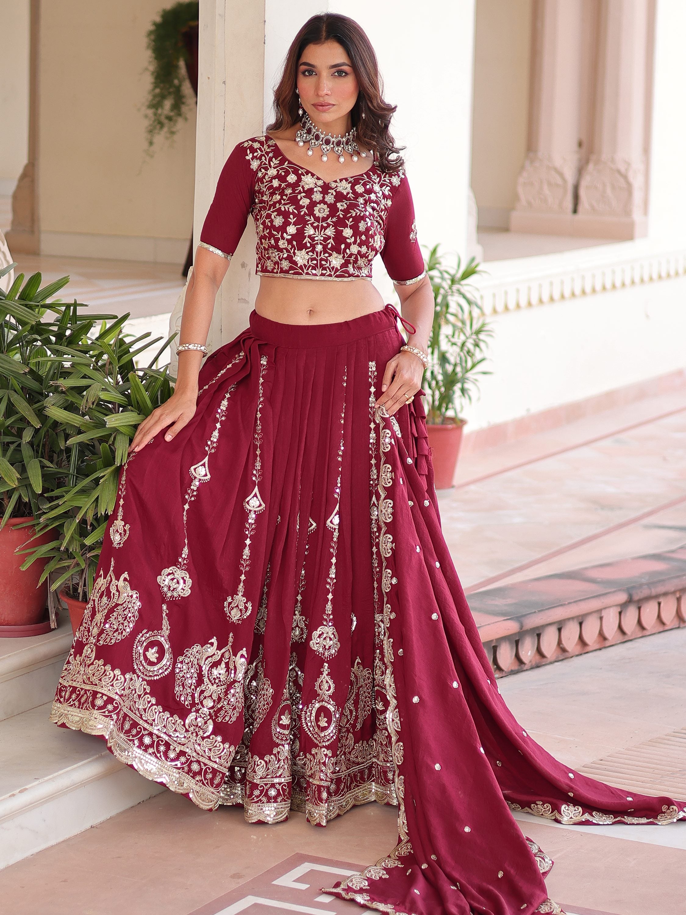 This beautiful maroon full-stitched lehenga set is crafted in premium vichitra silk, highlighted with heavy sequins and thread embroidered work all over. It has a rich bridal flair of 3 meters, soft cotton inner lining, and is stitched with canvas for perfect volume and comfort.