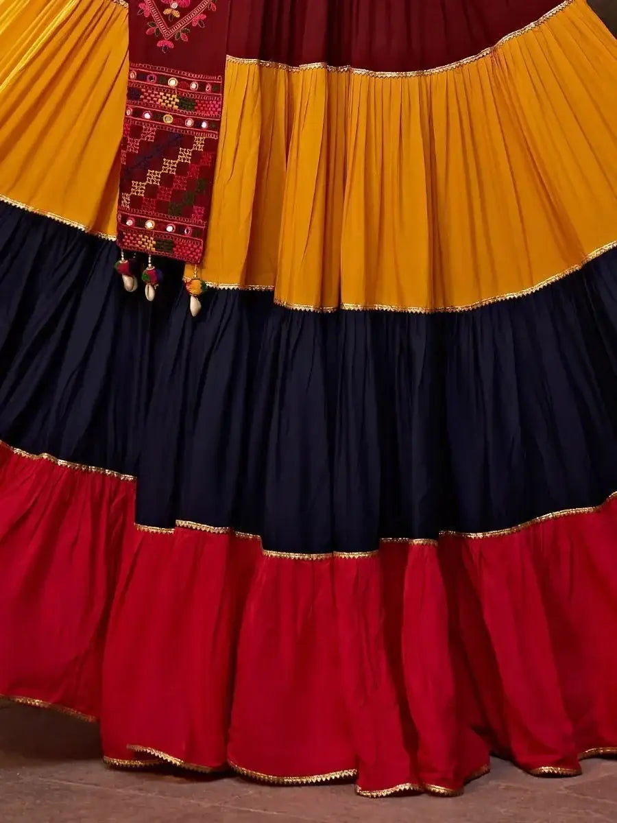 Crafted with high-quality rayon fabric, this lehenga choli offers a comfortable and soft feel against the skin. The attractive multi-thread embroidery adds a traditional and festive touch, making it perfect for occasions like festivals, Navratri, Garba, and other celebrations.