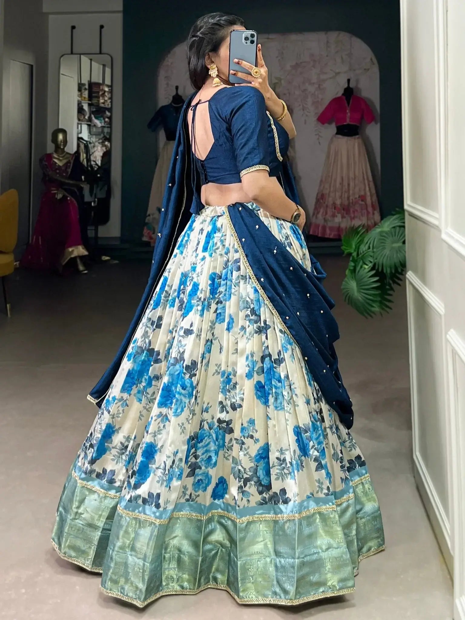 The off-white lehenga is stitched up to 42 inches and is available in size M, making it a versatile and comfortable option for a range of body types. The intricate floral print work, zari weaving, and lace border work add a touch of elegance and sophistication to the outfit, while the navy blue choli and dupatta complement the lehenga beautifully.