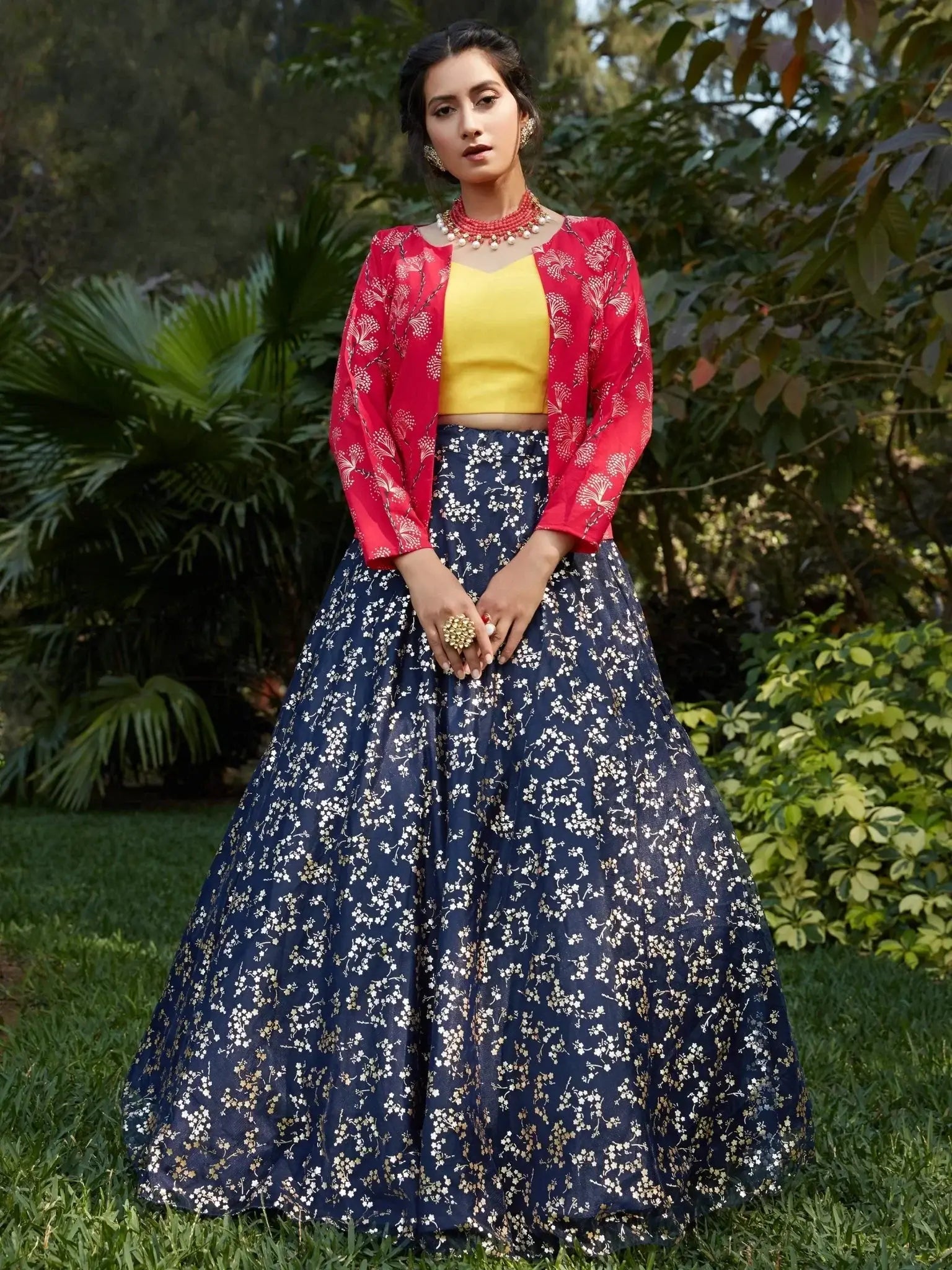 Adding a vibrant contrast, the set includes a yellow georgette crop top that infuses brightness and youthful energy into the look.