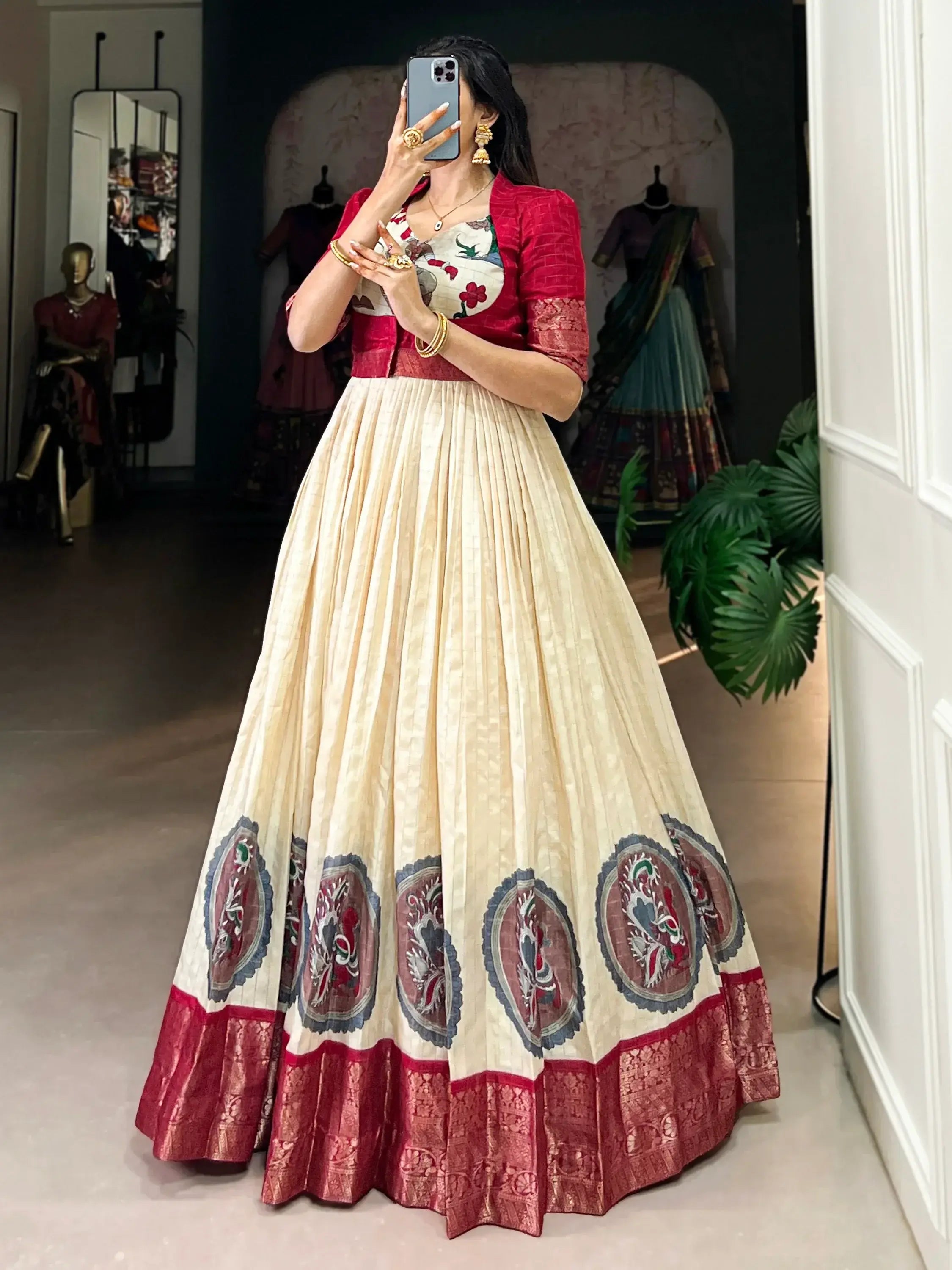 The intricate kalamkari print adds a pop of color and texture, while the zari weaving border work adds a touch of glamour and sparkle. The red color dola silk jacket complements the gown perfectly, adding a bold and stylish element to the ensemble.