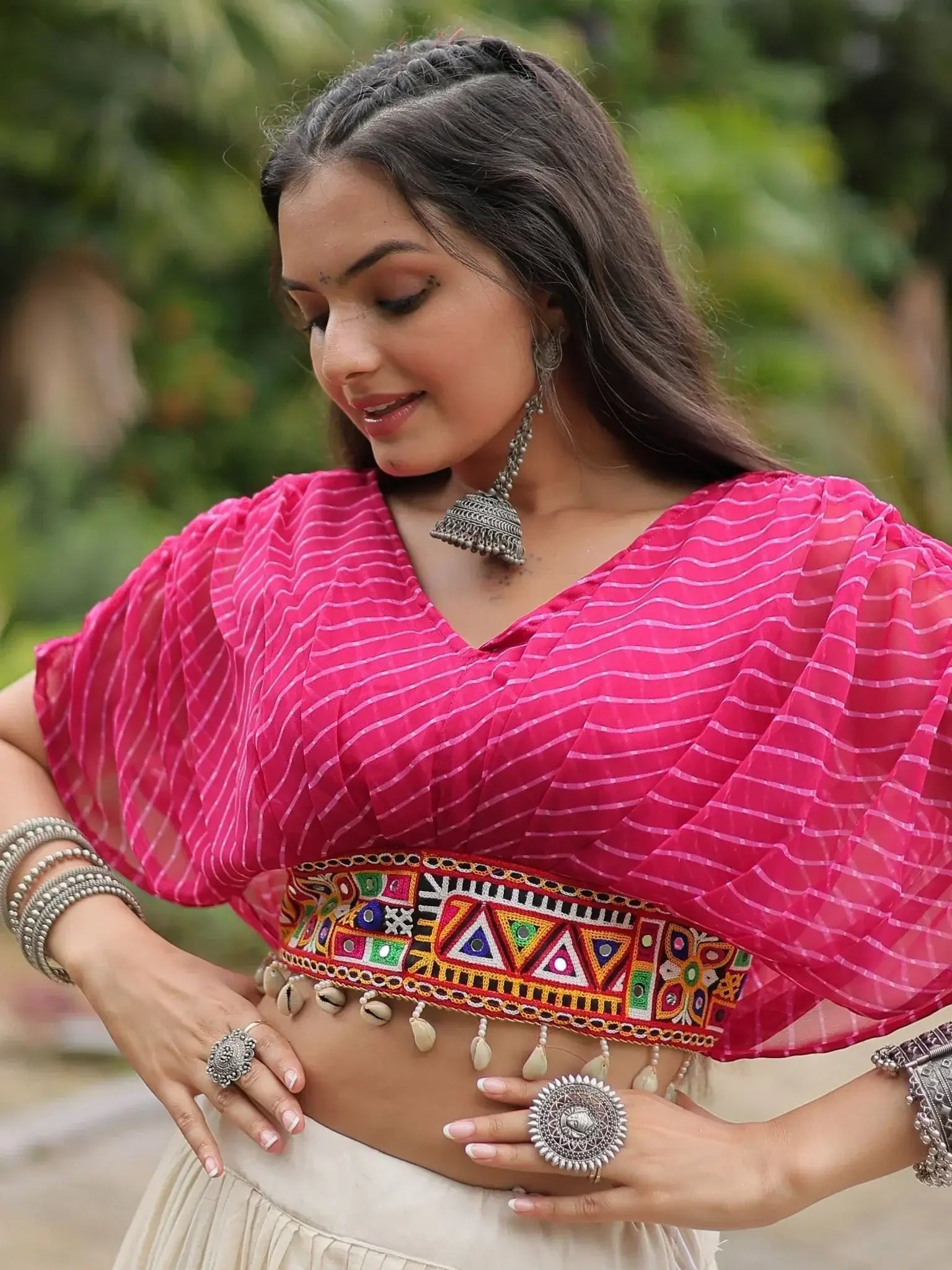 Introducing the attractive pink kutchi work georgette lehenga choli, an exquisite choice for navratri celebrations. The high-quality georgette fabric and intricate kutchi embroidery create a vibrant and elegant look that stands out at any festive occasion.