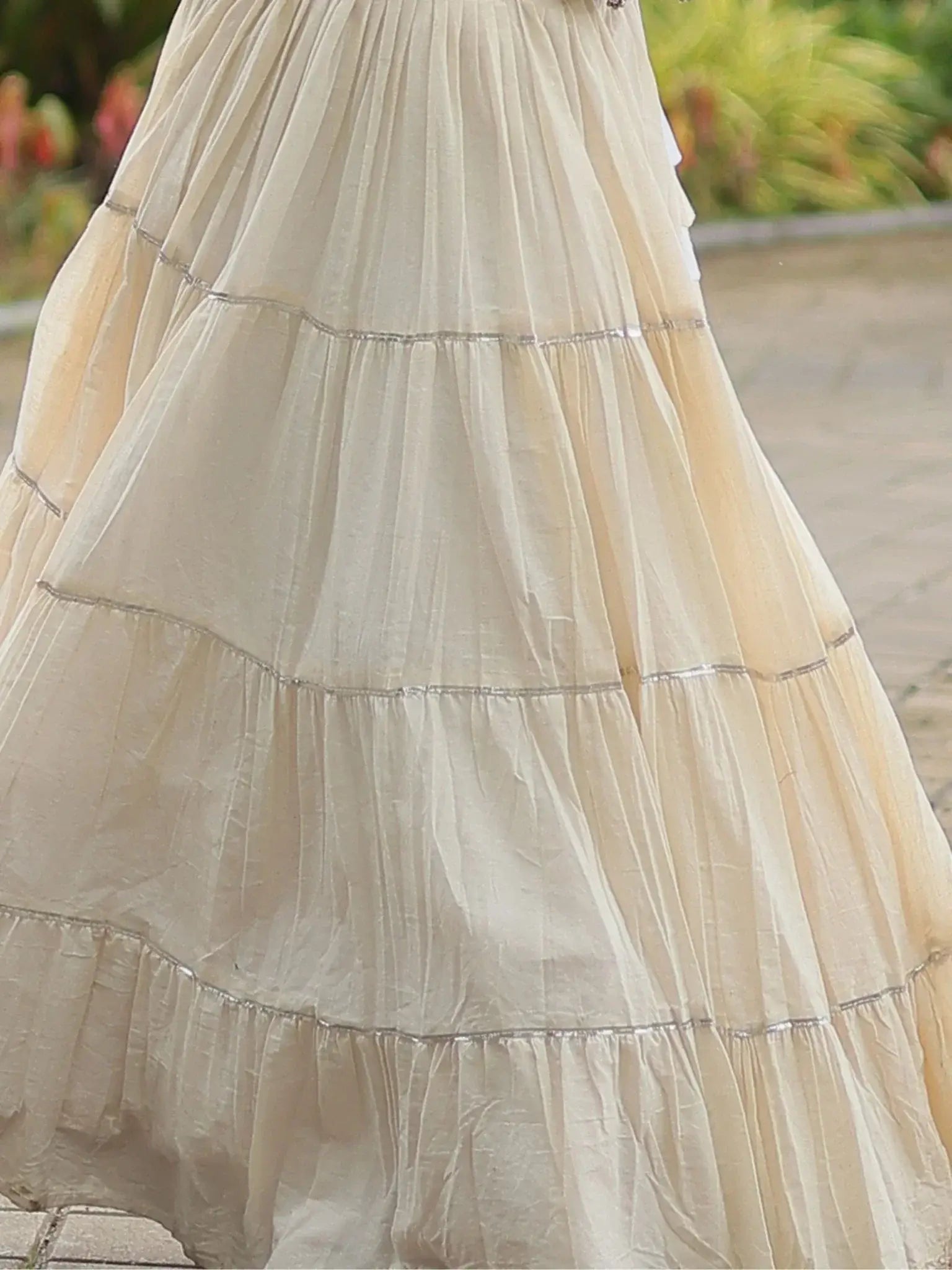 The cream lehenga is crafted from kora cotton with standard frill stitching, providing a 12-meter flair for a graceful and flowing drape. With a length of 42 inches and a waist of 42 inches, it is designed for a perfect fit and includes a chain closure with dori latkan.
