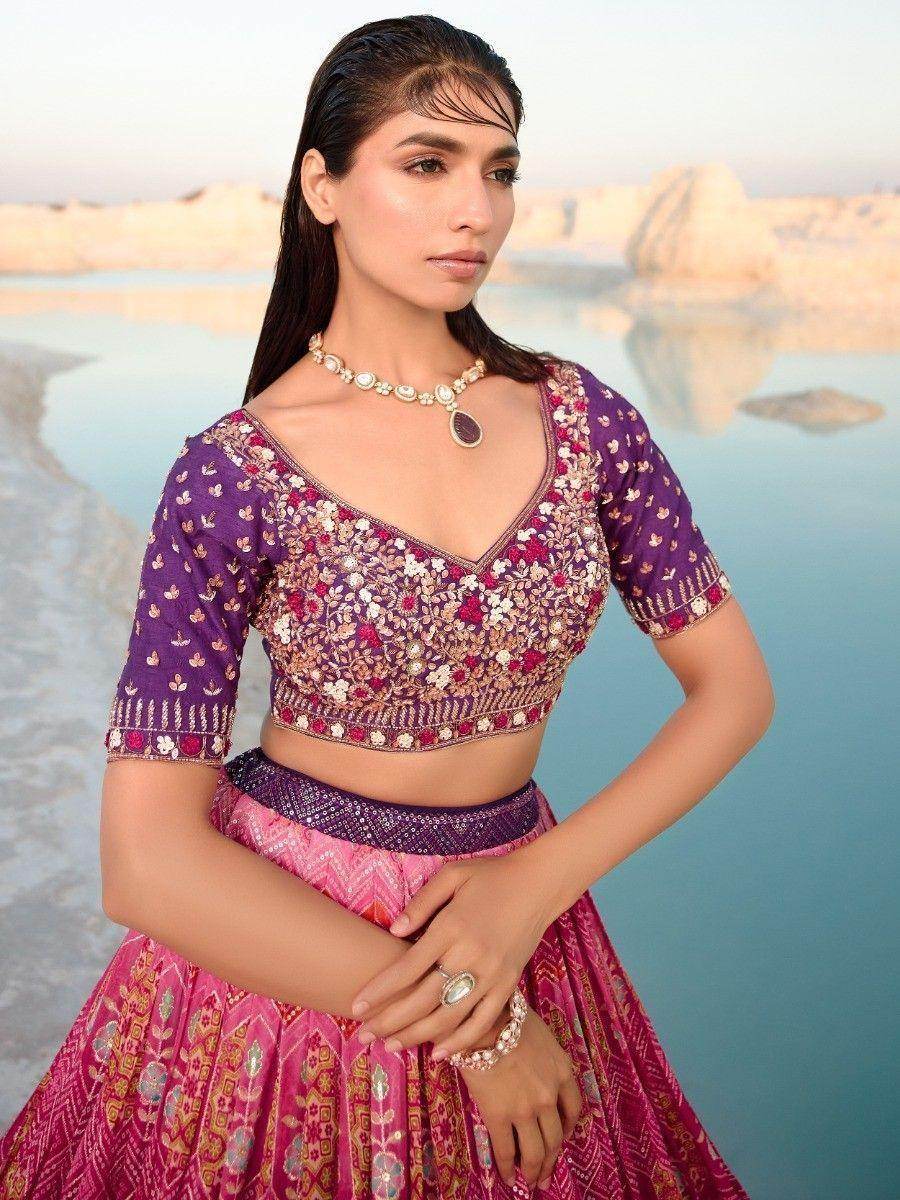 The attractive pink & purple sequins georgette wedding wear lehenga choli is available in four sizes – S-36, M-38, L-40, and XL-42, all fully stitched for your convenience. The customizable measurement group ensures a perfect fit, allowing you to feel comfortable and confident throughout the day.