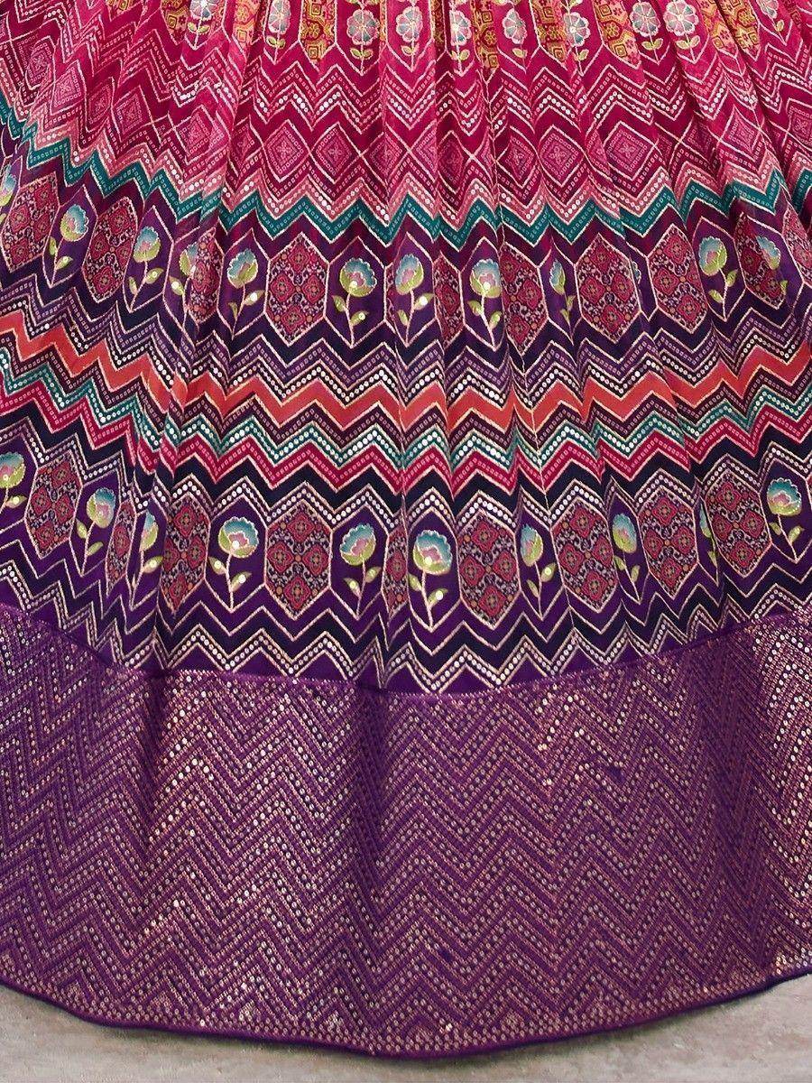 Complementing the lehenga is a matching purple georgette choli, adorned with intricate sequin work and thread embroidery. The combination of these details creates a visually stunning and cohesive look.