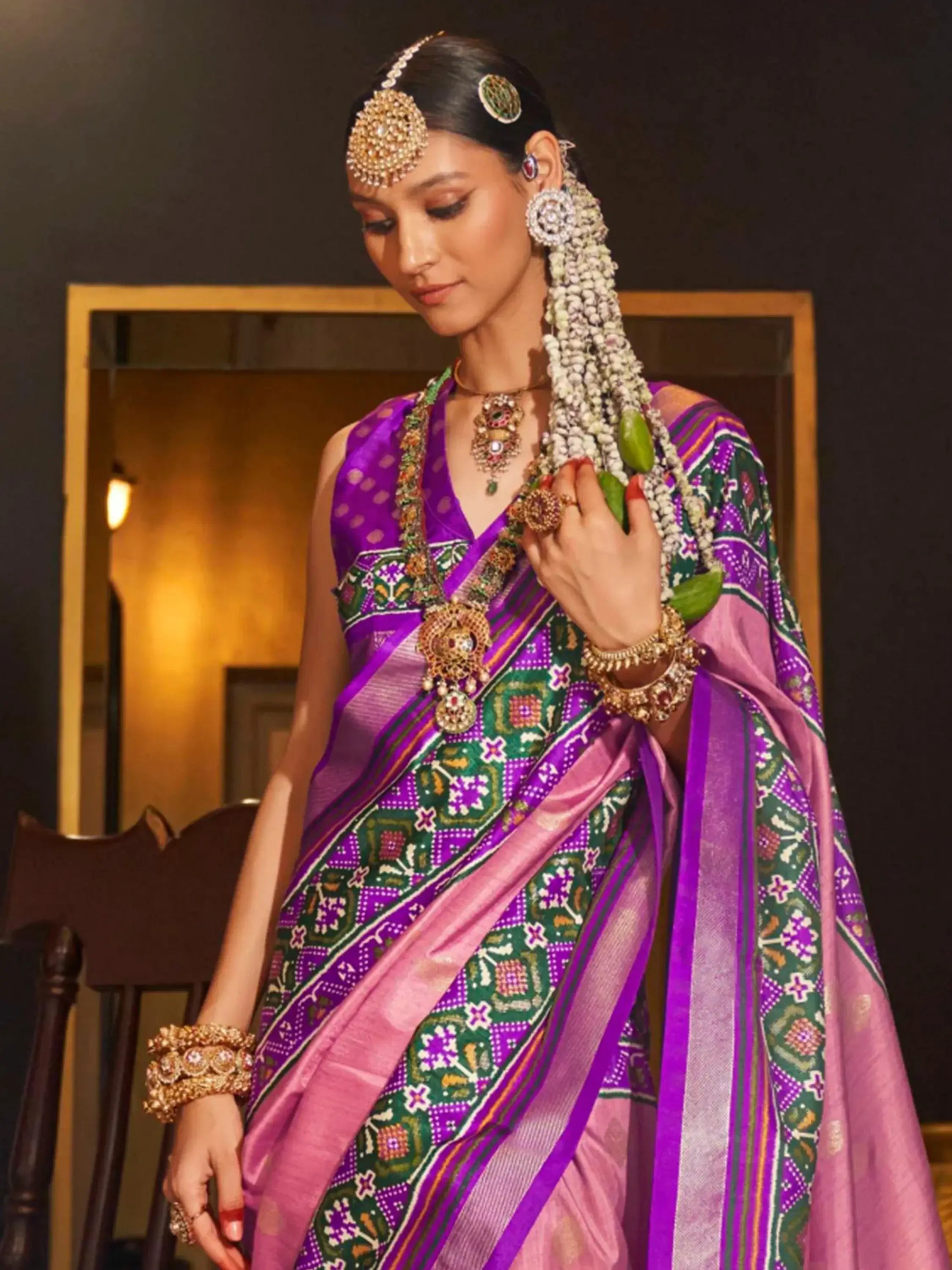 Ideal for weddings and festival seasons, this patola-printed saree embodies grace and sophistication. Its intricate detailing and vibrant hues are perfect for celebrating special moments.
