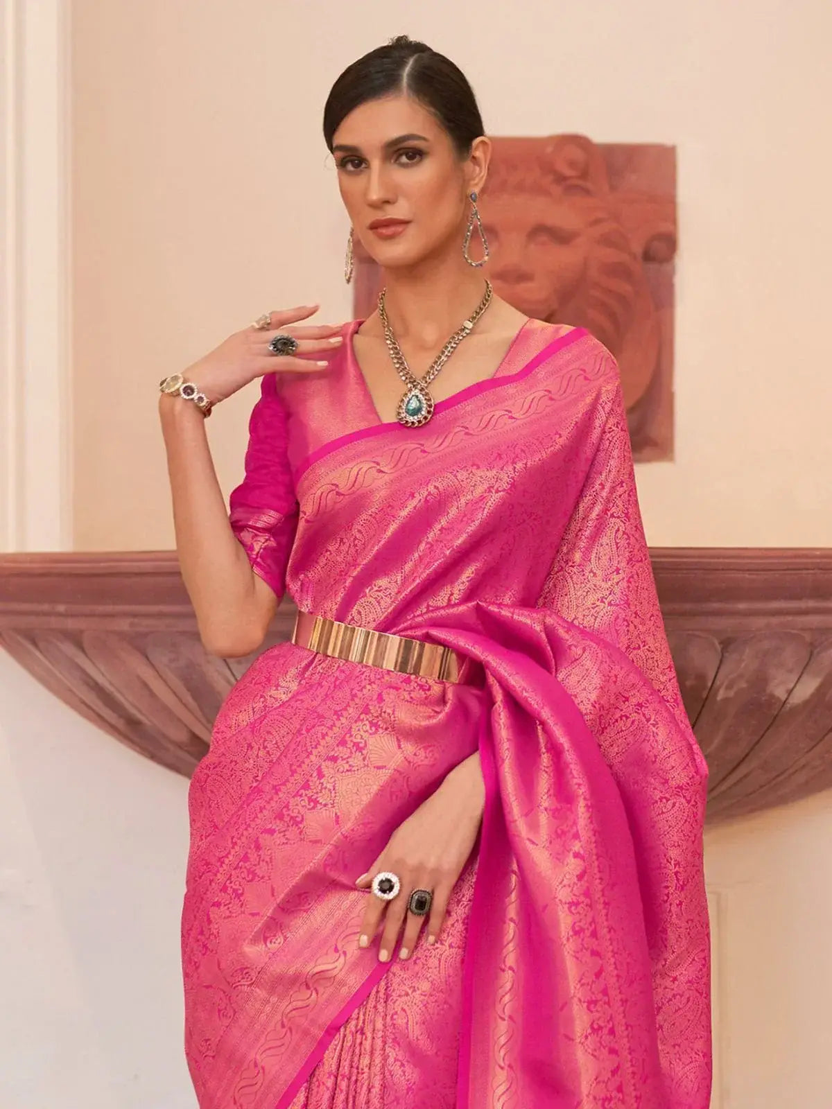 Elevate your style and make a statement at weddings, festivals, and other special occasions with our attractive pink zari weaving silk function wear saree with blouse. This stunning saree set includes a vibrant pink silk saree with intricate zari weaving work, along with a matching silk blouse also adorned with zari weaving details.