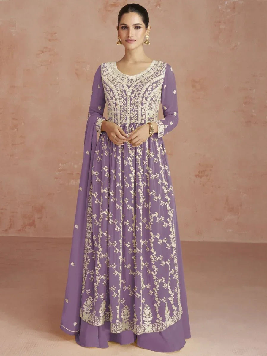 Looking for a fashionable and elegant outfit for festivals, events, or family gatherings? Look no further than Ethnic Plus! Introducing our new "Attractive Purple Thread Embroidered Georgette Palazzo Suit" - a stunning ensemble that is sure to turn heads and make you feel like royalty.
